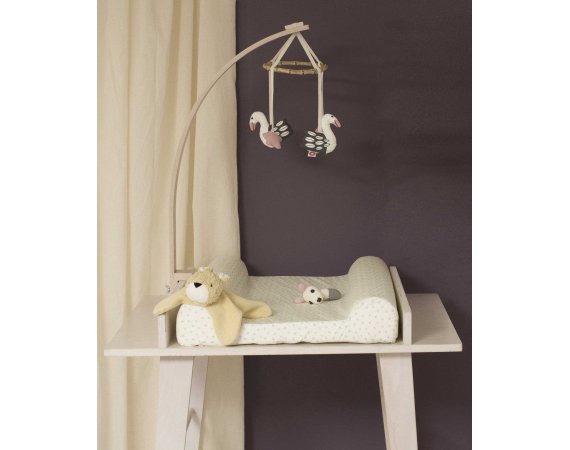 Bøjlen fastgøres let på seng eller kravlegård med to velcrobånd. Velcrobåndene gør, at mobilen sidder fast og stabilt, der hvor den bliver påsat.