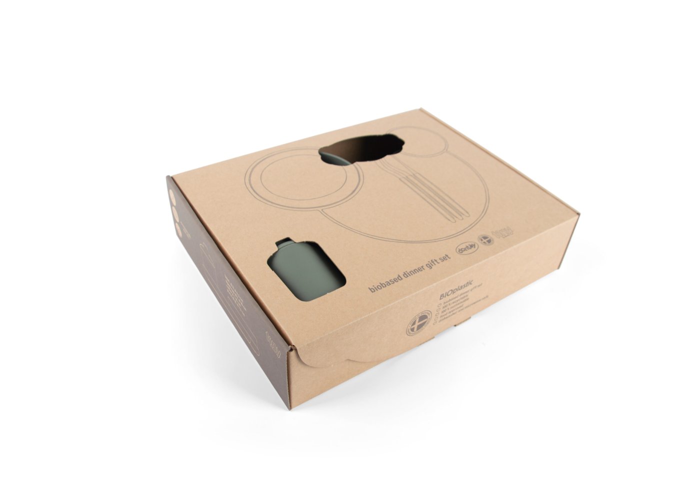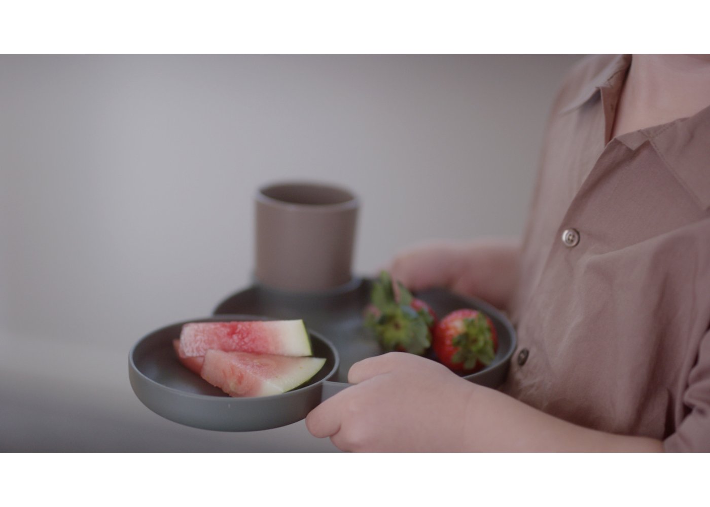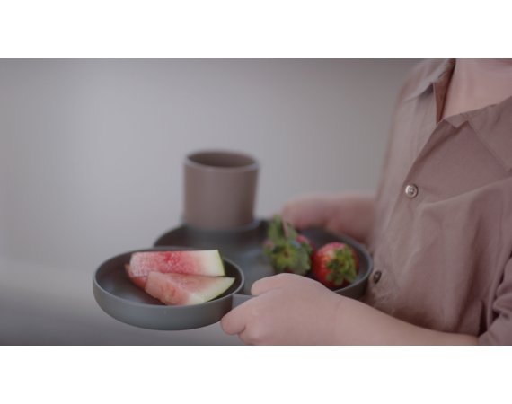 Opdelt tallerken, hvor tallerkenens to mindste rum kan rumme kop og skål og bruges som bakke til at bære maden samlet, hvis der ikke er mad i dem.