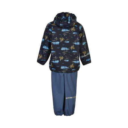 Praktisk og slidstærkt PU-regnsæt med print af skibe og blæksprutter på jakken og ensfarvede bukser i blå.