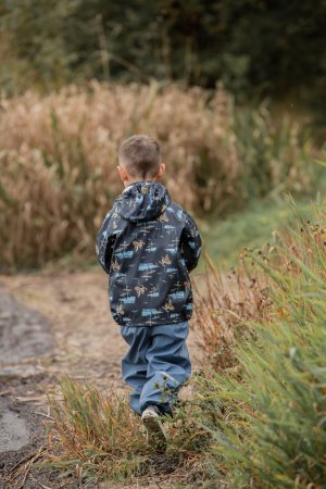 Sættet har lynlås og trykknapper. Jakken har aftagelig hætte og der er velcro i ærmer, så regn og vind kan holdes ude. Der er desuden elastik ved ankler, elastiske fodstropper og refleksstribe på højre arm og ben.