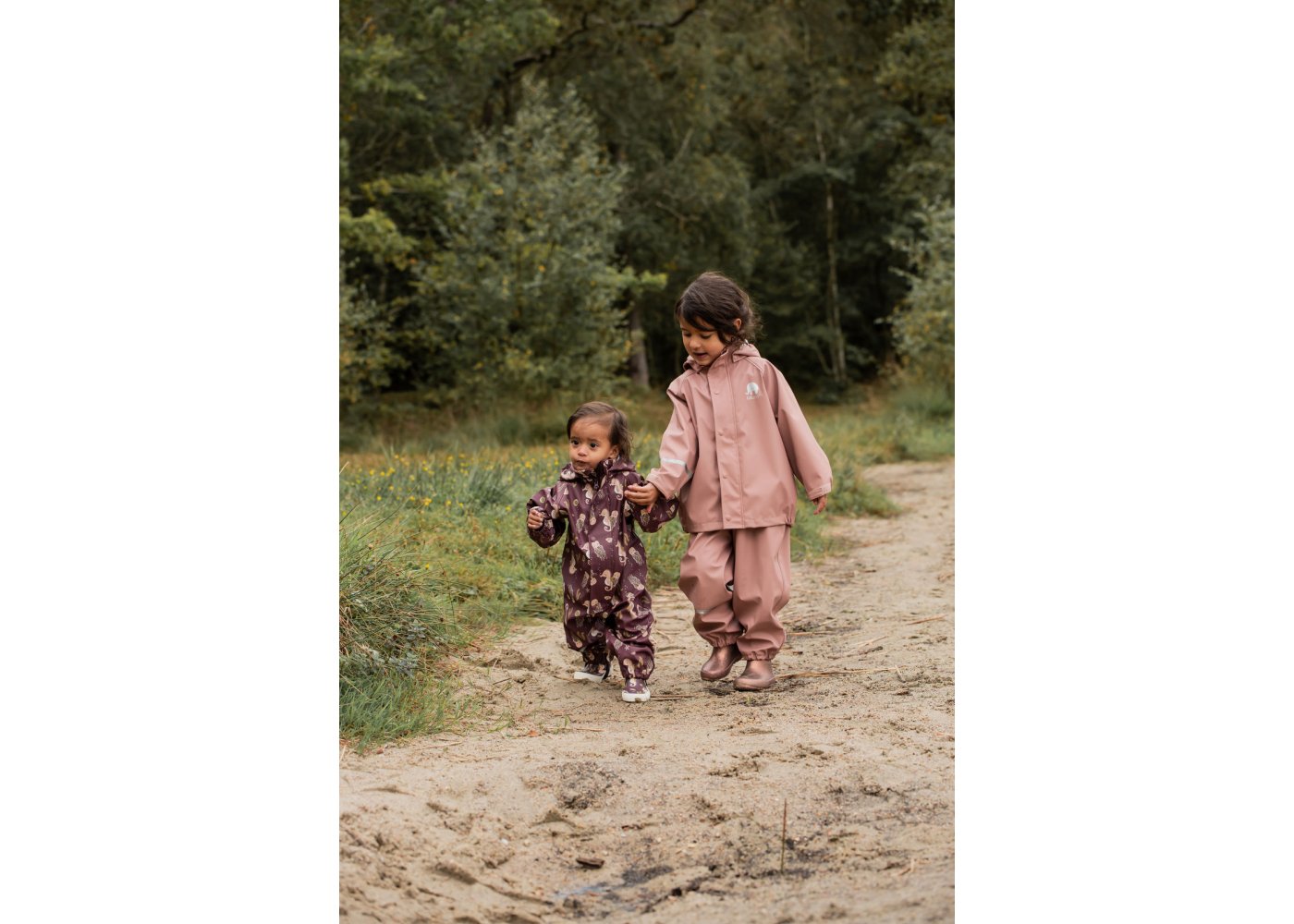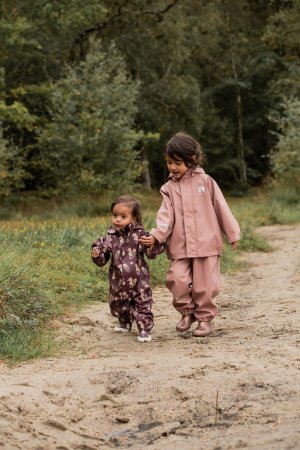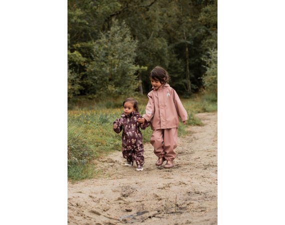 Regndragten har en gennemgående lynlås med vindstoppe og trykknapper. Dragten har aftagelig hætte og et blødt fleecefoer i kraven. Desuden elastik ved håndled, ankler, justerbare elastiske fodstropper og refleksstribe på højre arm og ben.