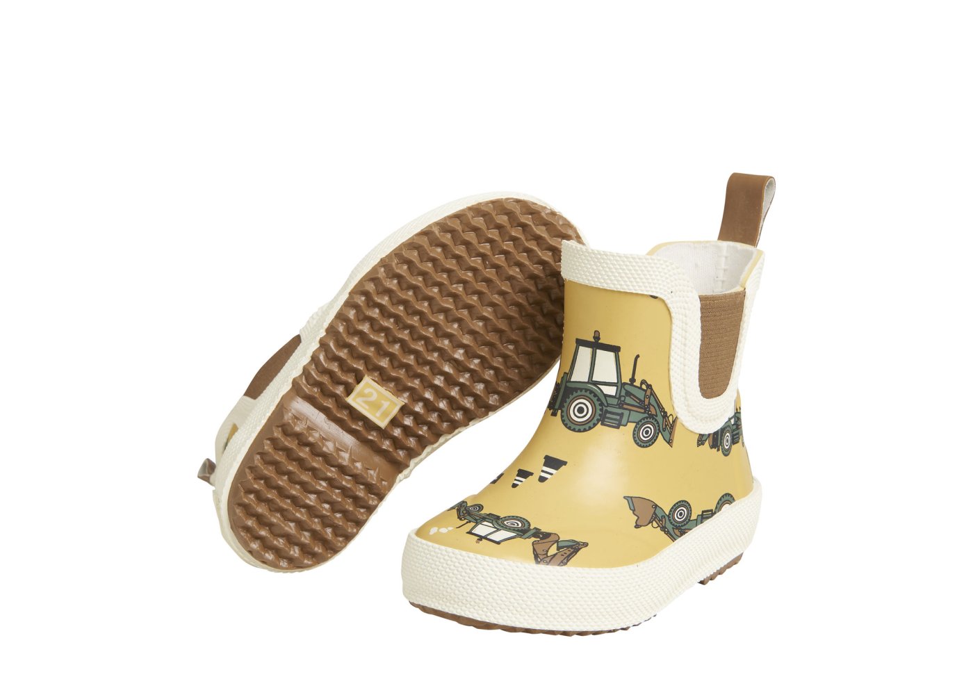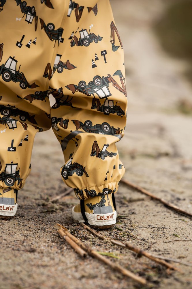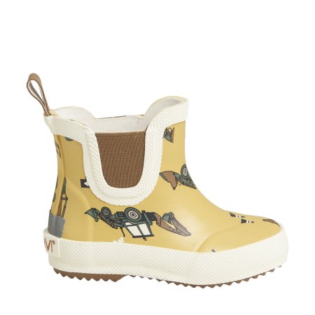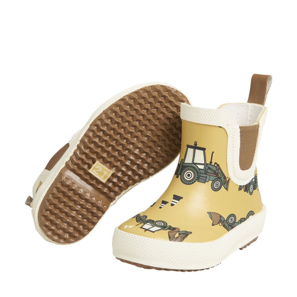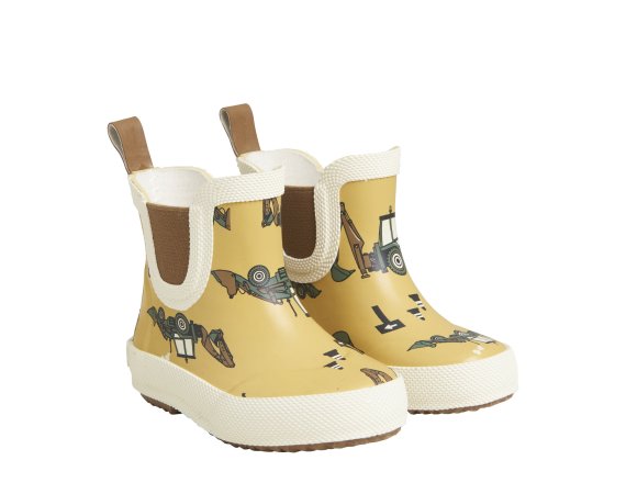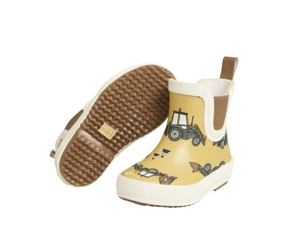 Kvalitets gummistøvler i gul med entreprenørbiler og refleks bag på hælen. Gummistøvlen er i en kort model med en praktisk elastik i siden, der gør det let at tage støvlen på. Støvlen har en let tekstilforing, og udtagelige såler. Ydersålen har et kraftigt skrid mønster, der sikrer et godt fodfæste. CeLaVi ligger vægt på at gummistøvler skal være funktionelle og komfortable, da de ofte bruges i flere timer ad gangen.
