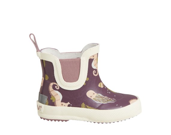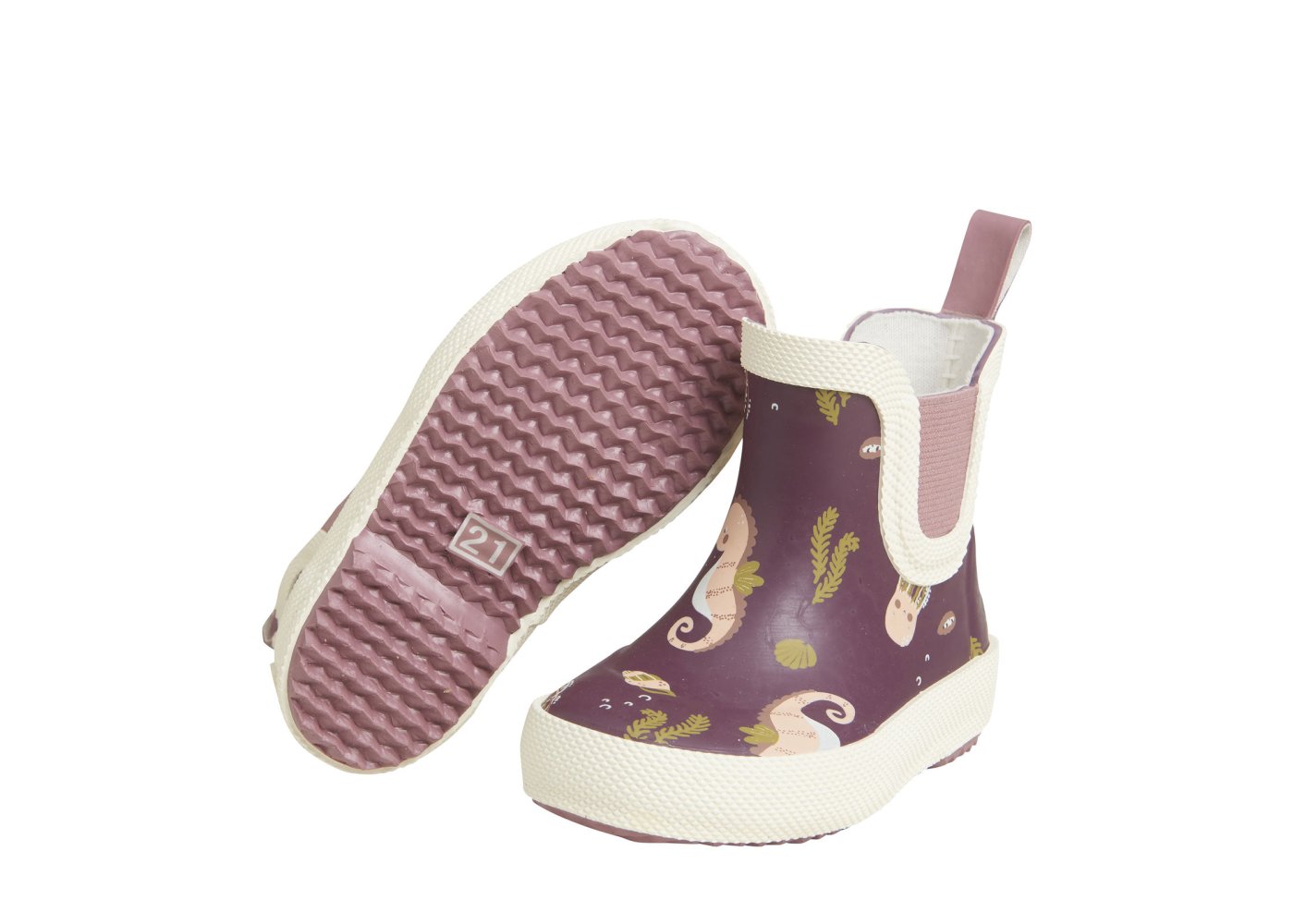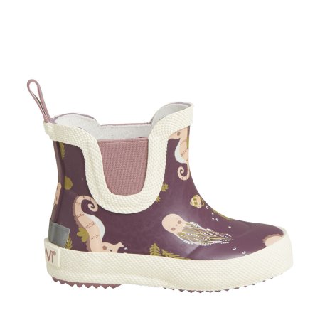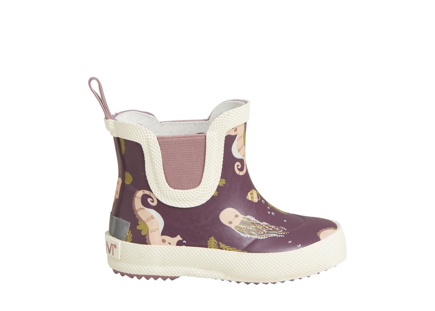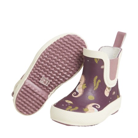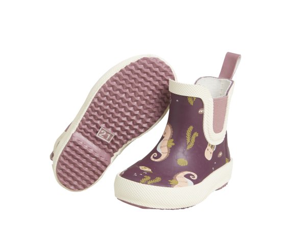 Kvalitets gummistøvler i mørk lilla med søheste og vandmænd og refleks bag på hælen. Gummistøvlen er i en kort model med en praktisk elastik i siden, der gør det let at tage støvlen på. Støvlen har en let tekstilforing, og udtagelige såler. Ydersålen har et kraftigt skrid mønster, der sikrer et godt fodfæste. CeLaVi ligger vægt på at gummistøvler skal være funktionelle og komfortable, da de ofte bruges i flere timer ad gangen.
