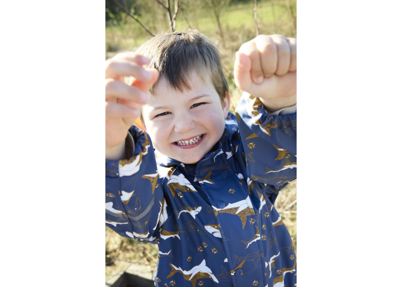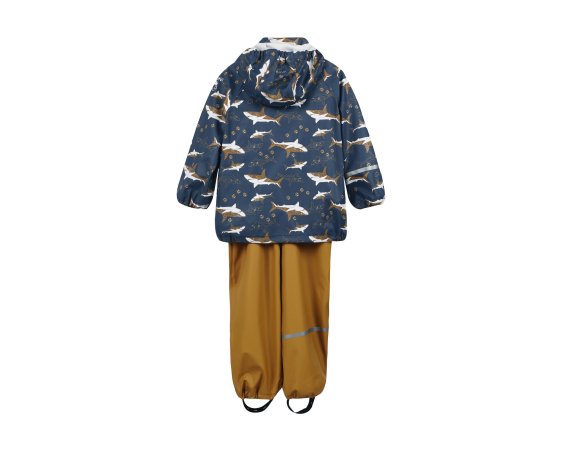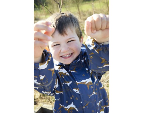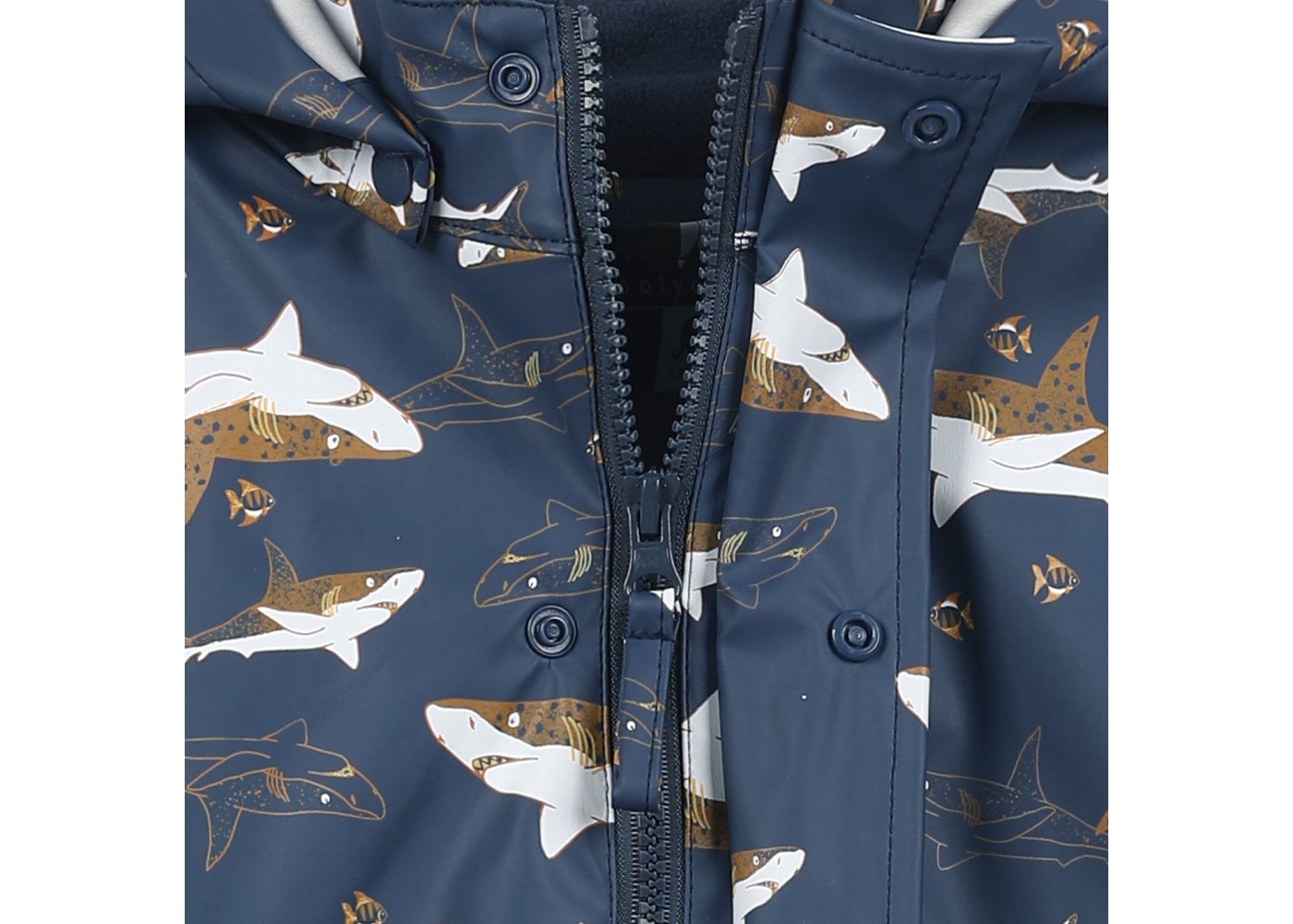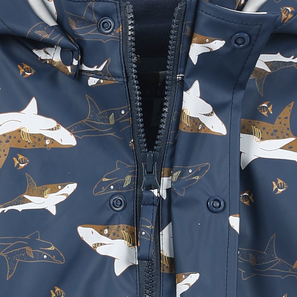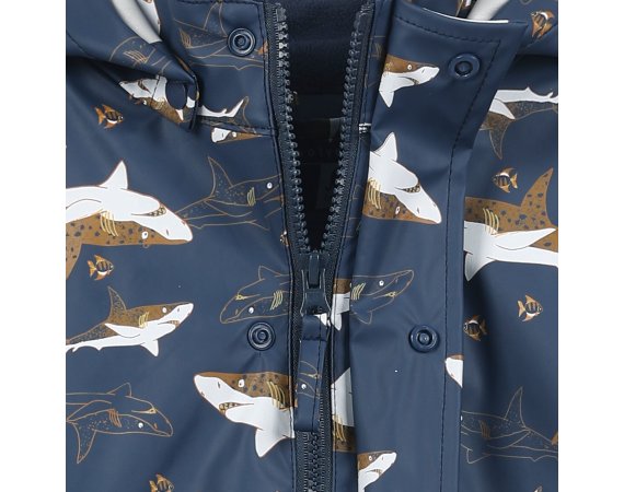 Varm, praktisk og slidstærk recycled PU-regntøj i blå og brun med haj print og lækkert fleecefoer i halskraven.