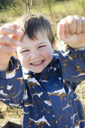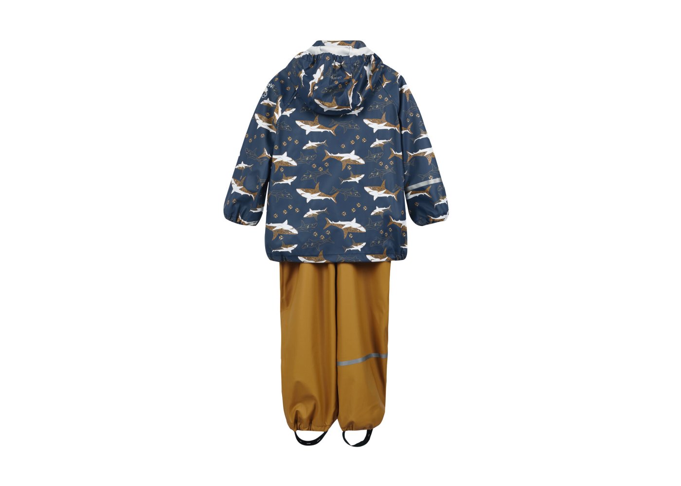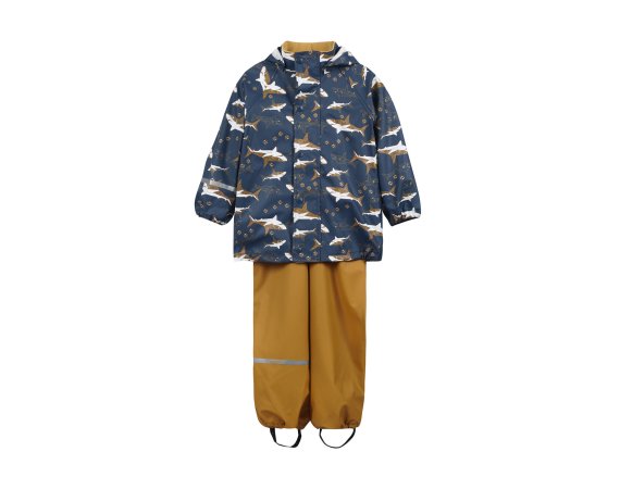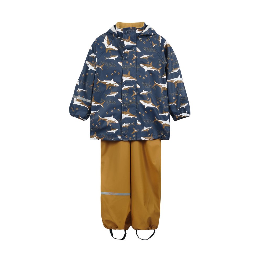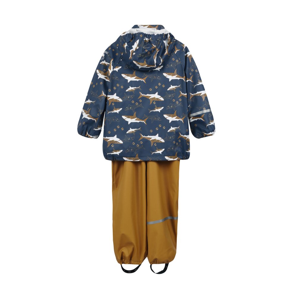 Varm, praktisk og slidstærk recycled PU-regntøj i blå og brun med haj print og lækkert fleecefoer i halskraven.