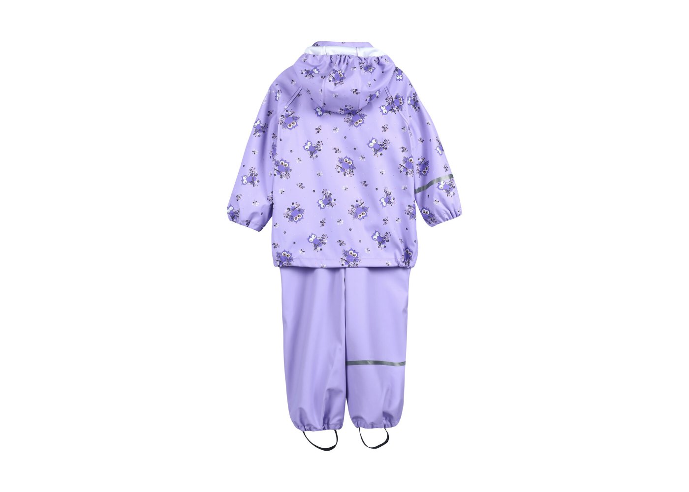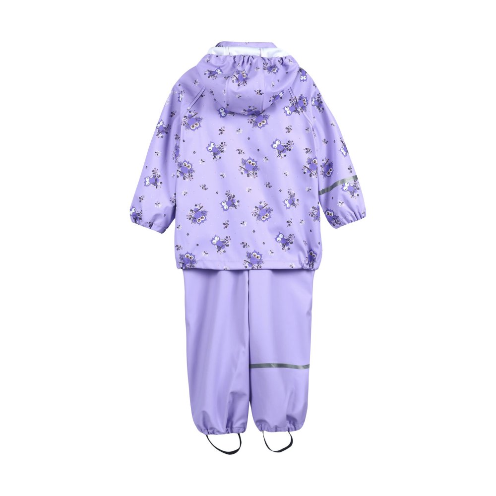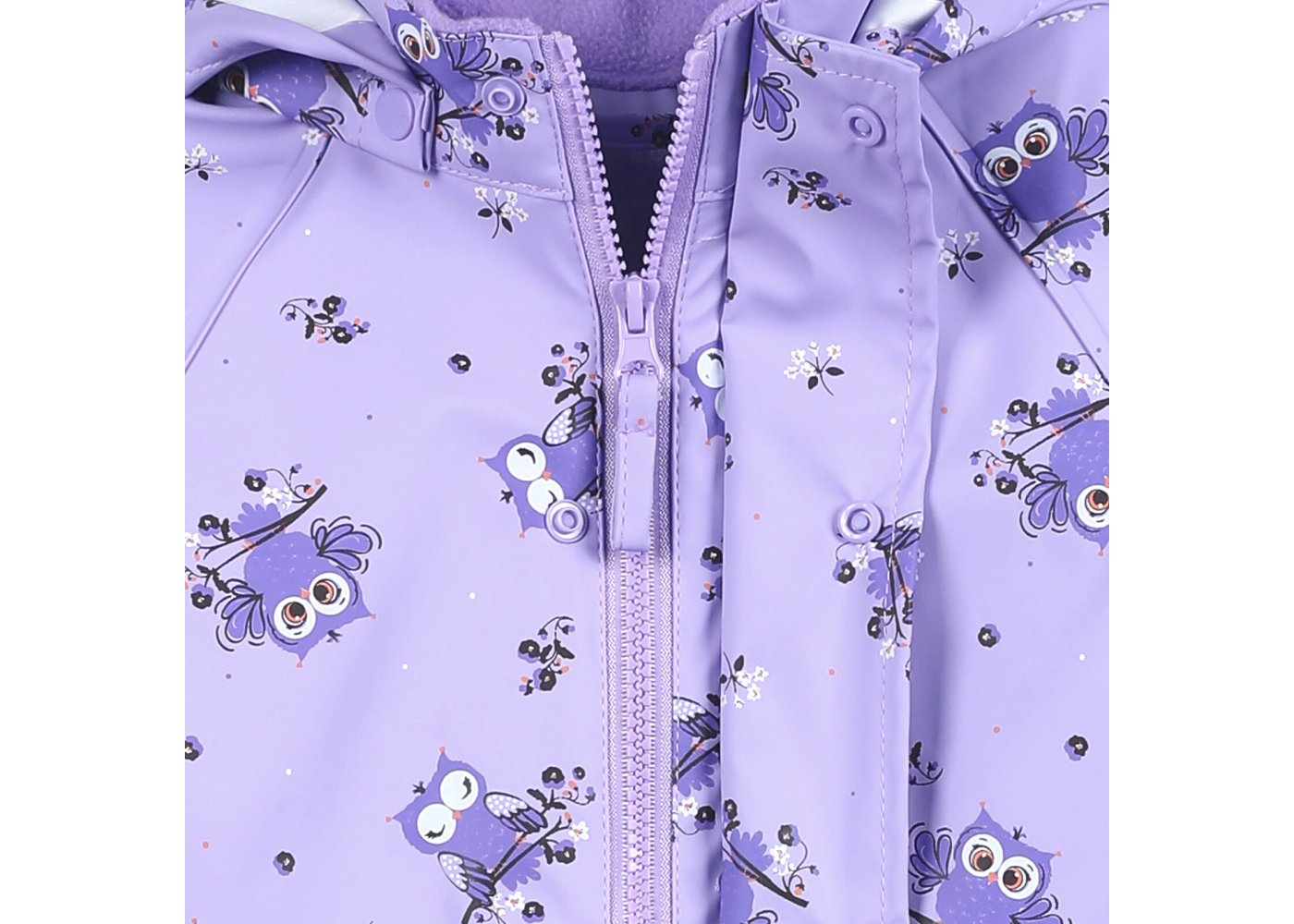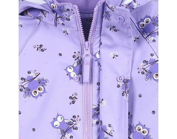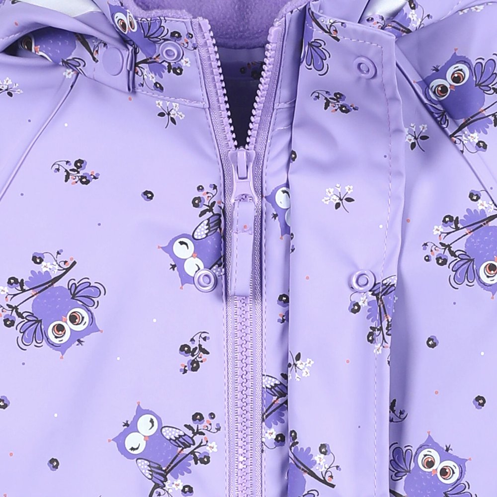 Varm, praktisk og slidstærk recycled PU-regntøj med ugle print og lækkert fleecefoer i halskraven.