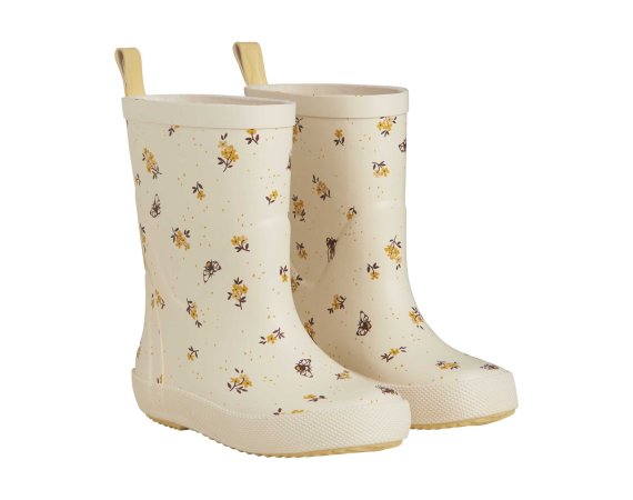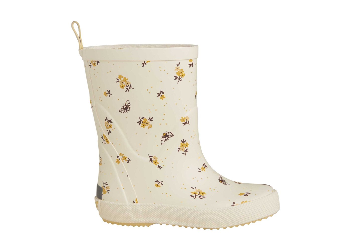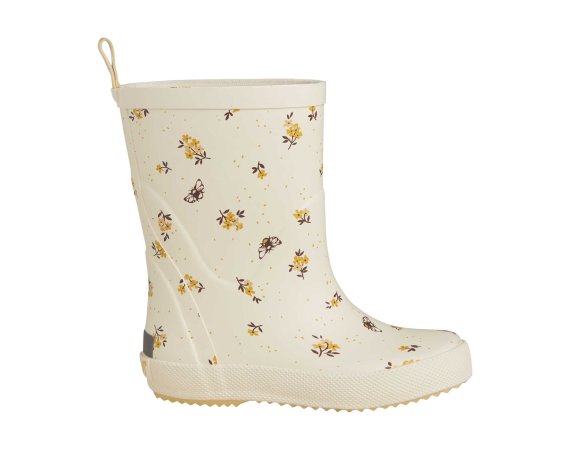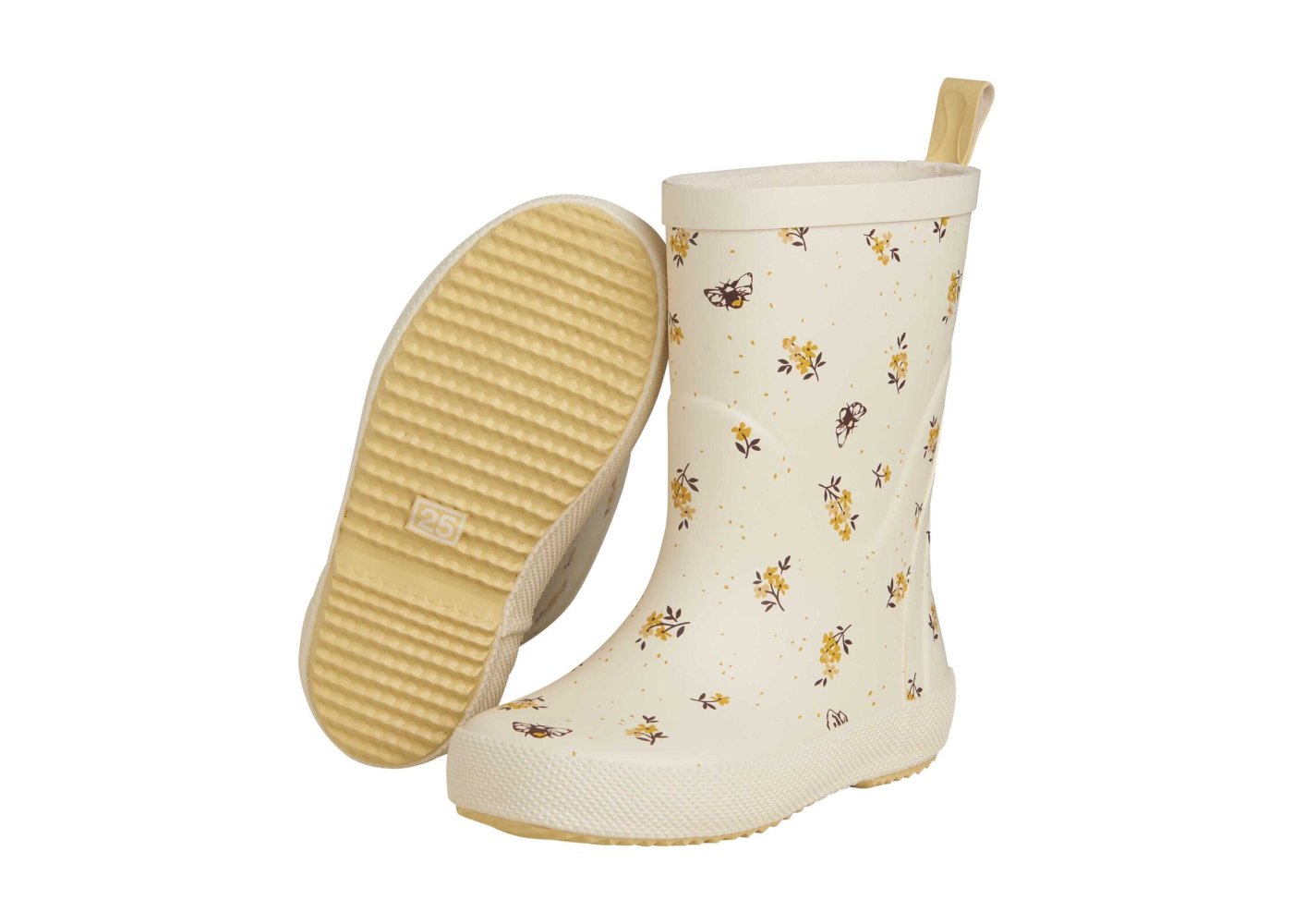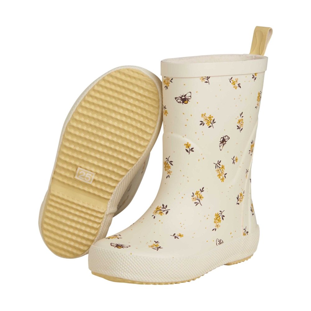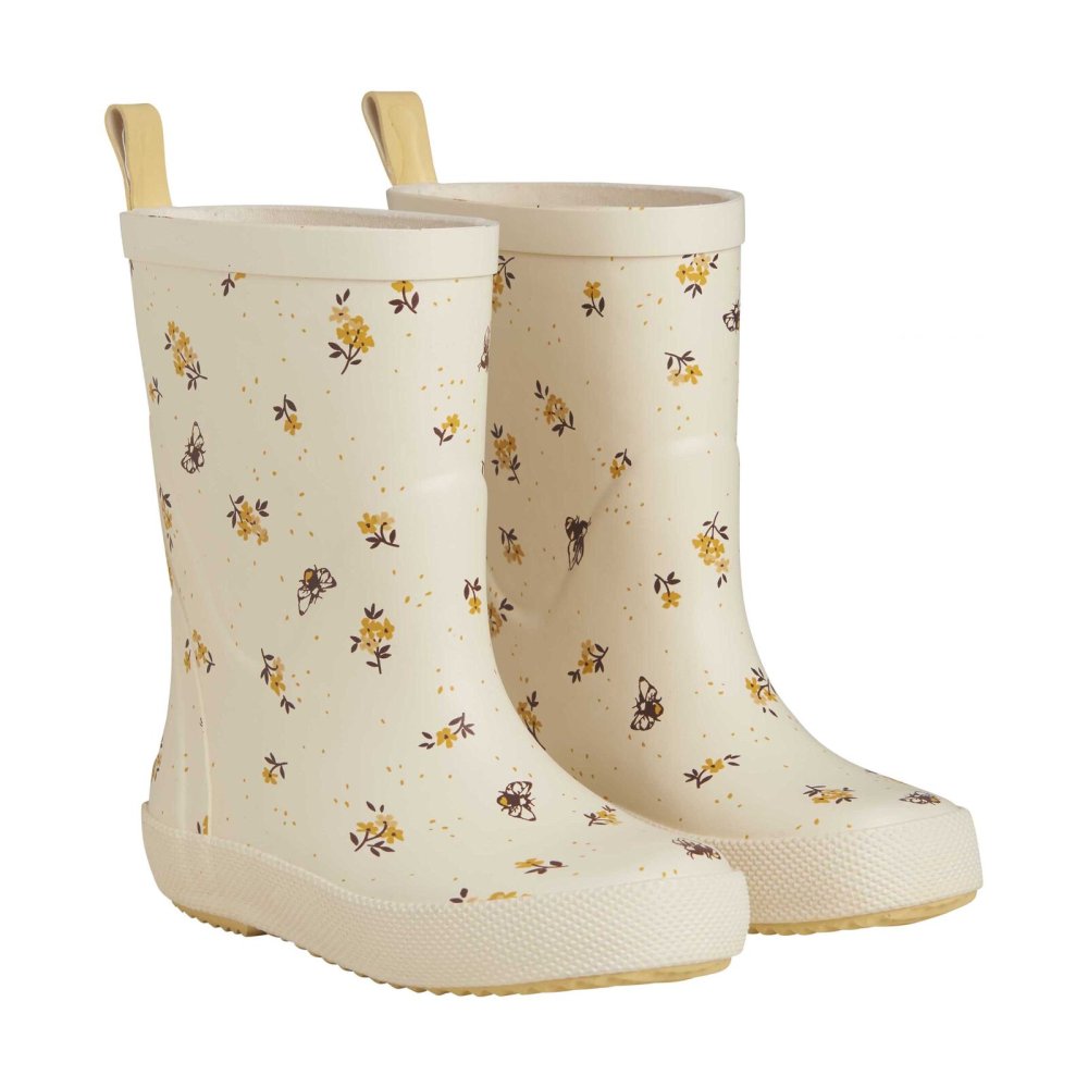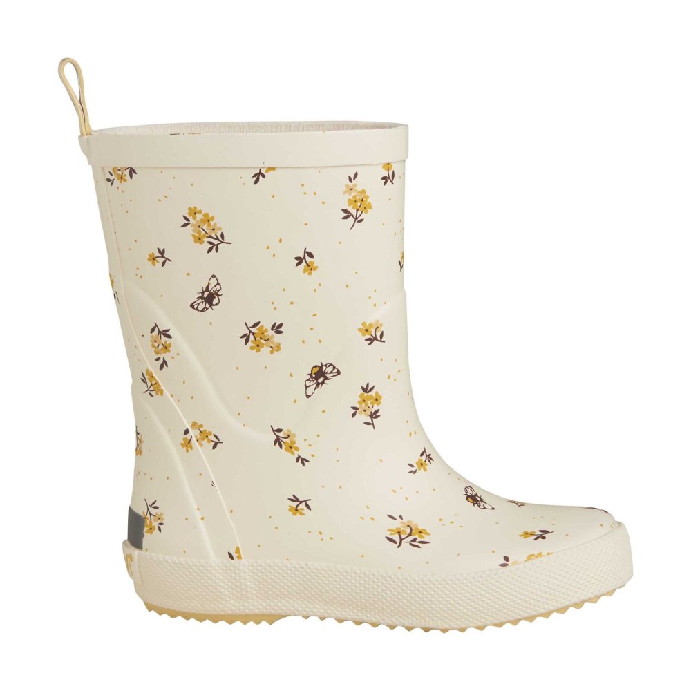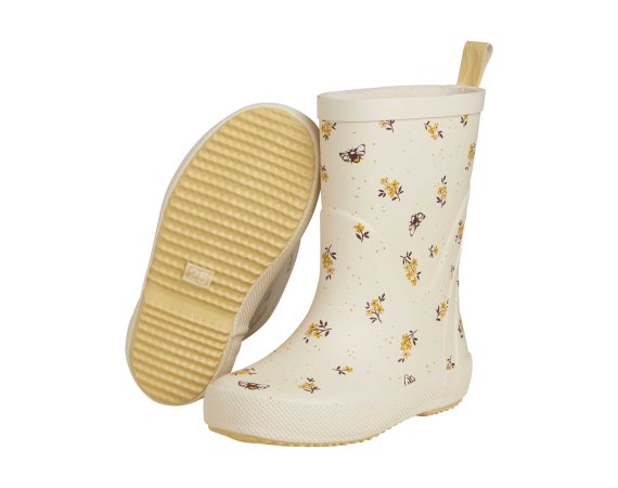 Kvalitetsgummistøvler med blomster og bier. Støvlen har en let tekstilforing og udtagelige såler. Støvlen er smallere i hælen, der sikrer god komfort, når barnet skal lege i dem i flere timer.