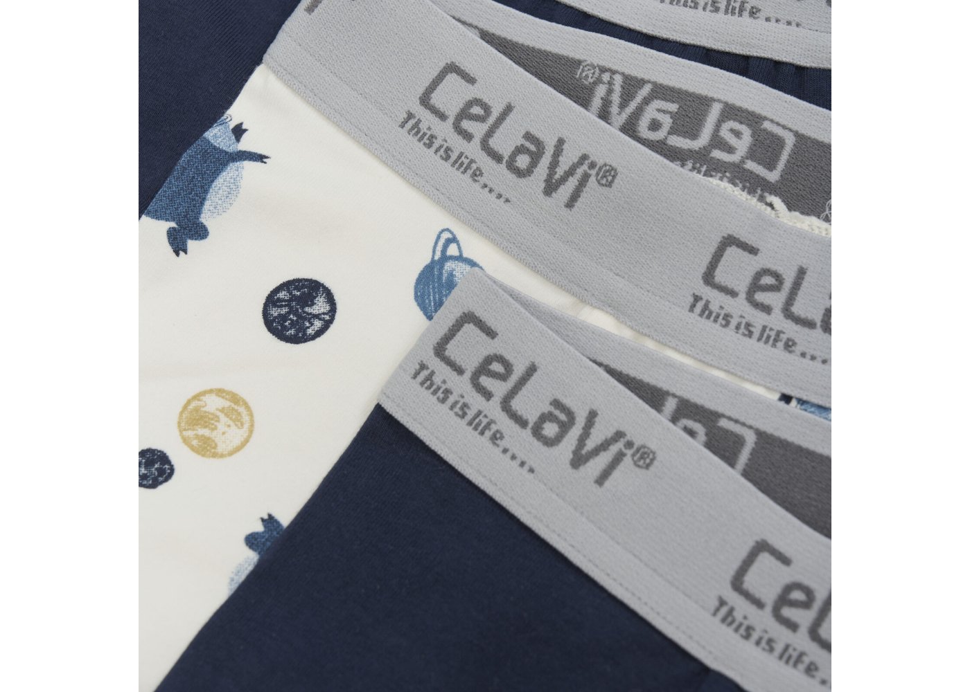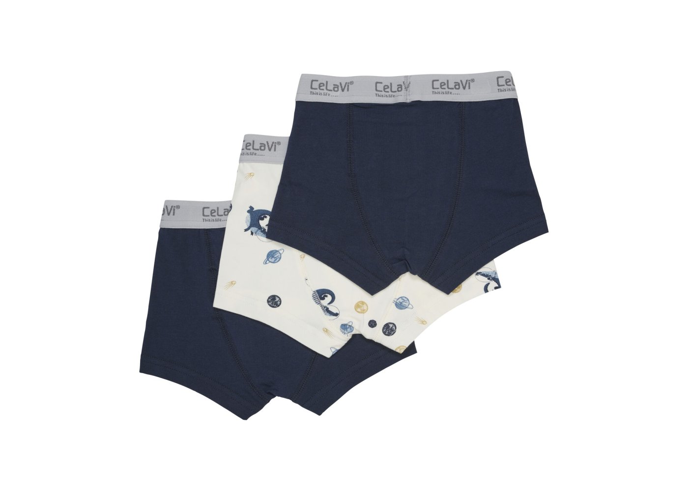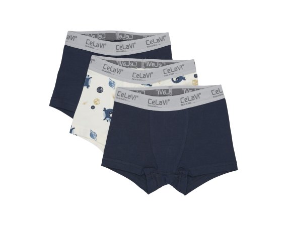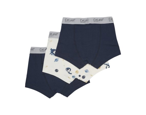 Tre forskellige Boxer-Shorts med elastik i taljen. De to er ensfarvede og har CeLaVi logo i elastikken. Underbuks nummer tre, har flot astronautprint. Shortsene har en behagelig pasform.
