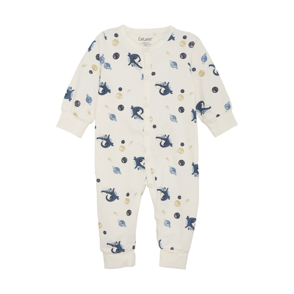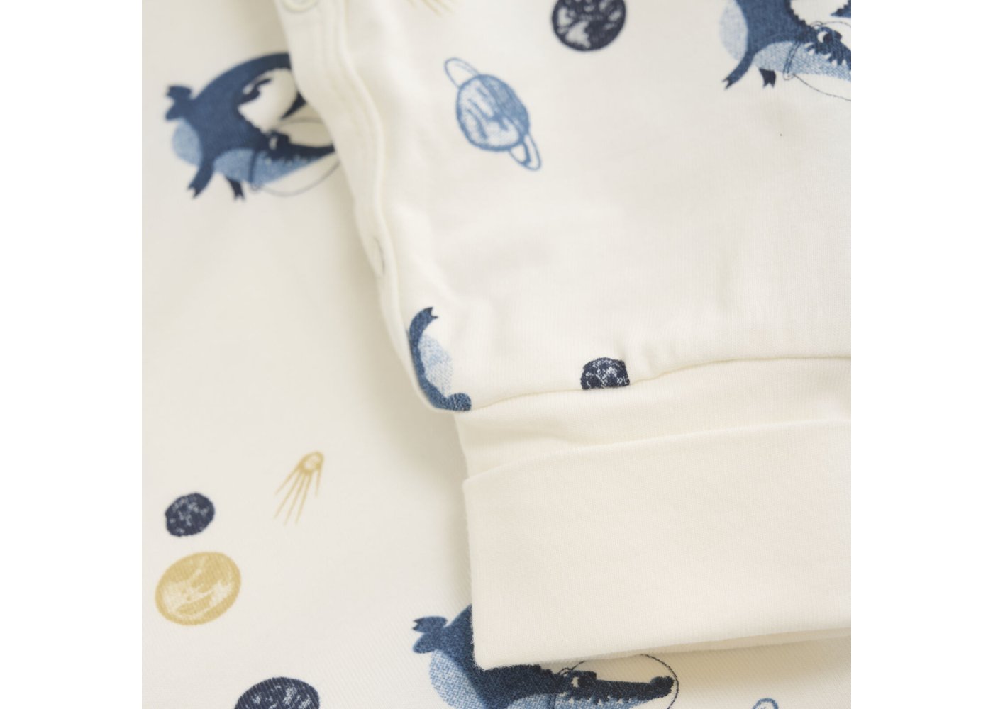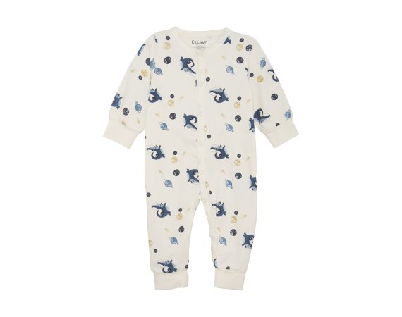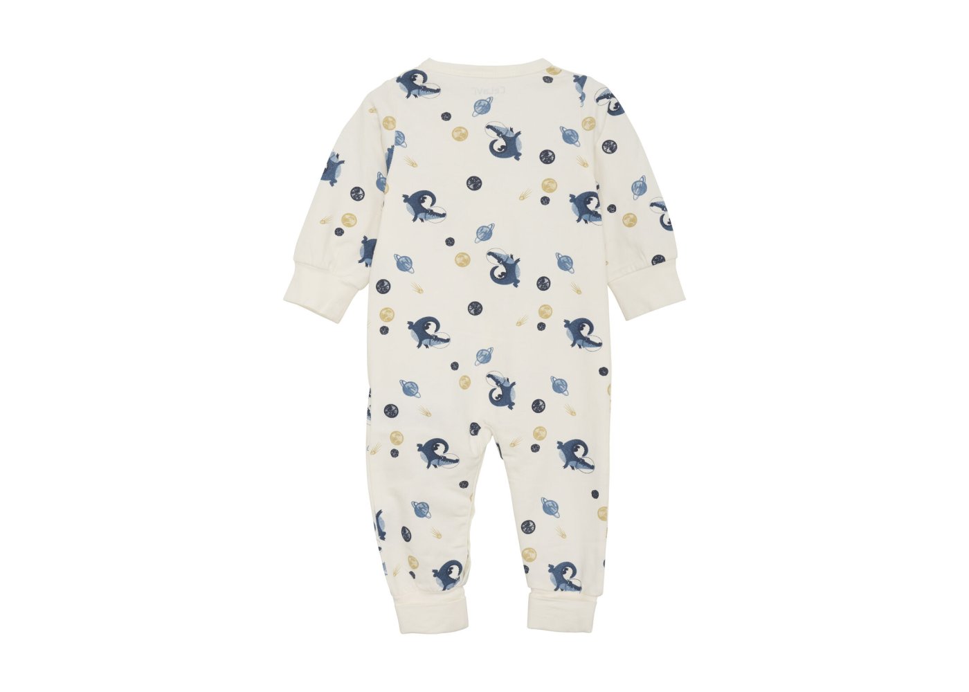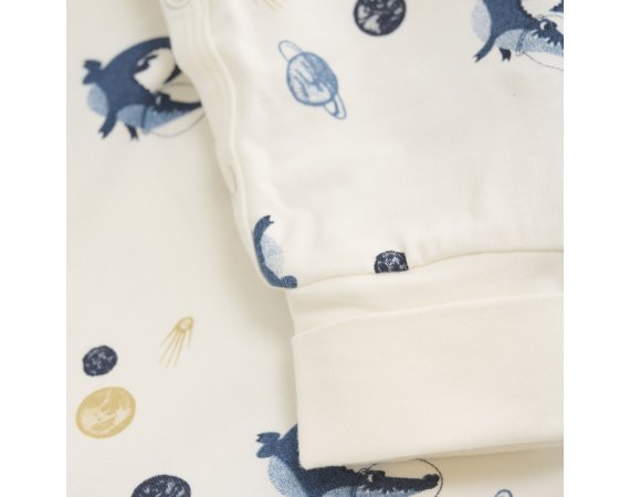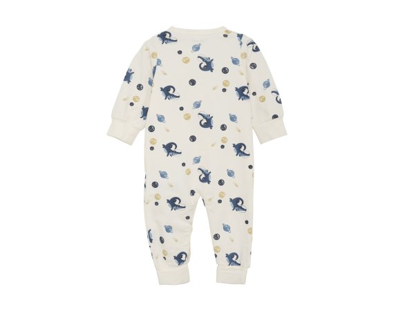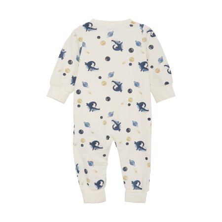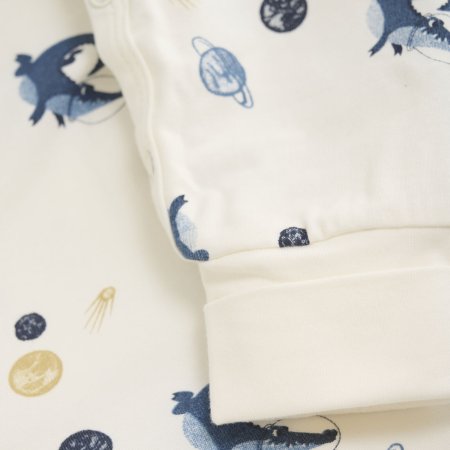 Natdragten har brede ribkanter i alle åbninger, og er udstyret med praktiske trykknapper fra hals til den ene ankel, der gør den let at få på og af igen.