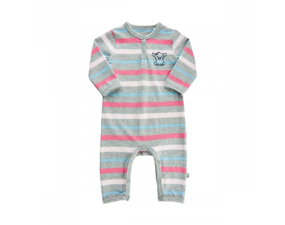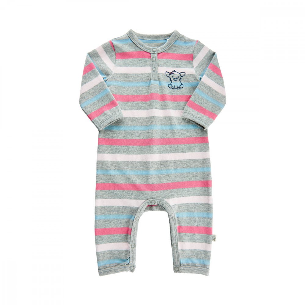 Skøn stribet bodysuit med striber og print af en nuttet lille kalv Heldragten har fin stolpelukning med trykknapper foran og kan åbnes helt mellem ben. Tekstil: 95% Bomuld, 5% Elastane