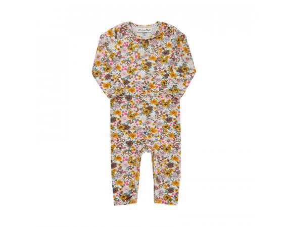 Farverig heldragt i økologisk bomuld med sødt blomsterprint.Heldragten har en fin broderet kant i halsudskæring. Den lukkes med trykknapper på venstre skulder og imellem ben.