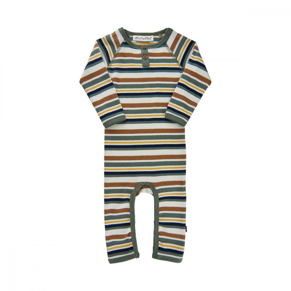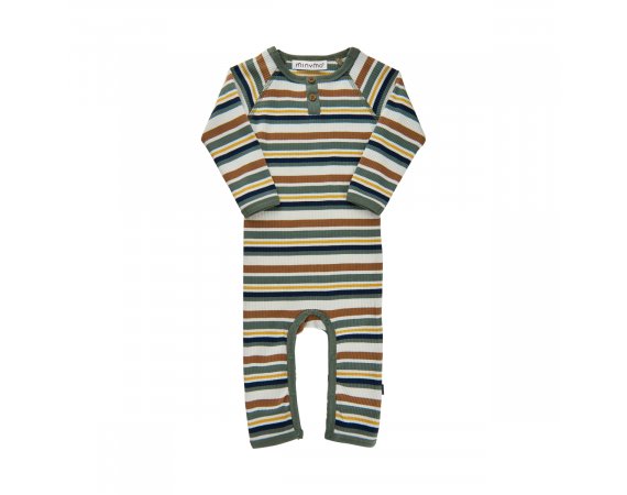Smart heldragt med striber i grøn, brun, blå, gul og hvid farve.Bodyen har grønne ribkanter i alle åbninger og en sød detalje med stolpelukning med knapper på brystet. Den lukkes med trykknapper på skulder og imellem ben.