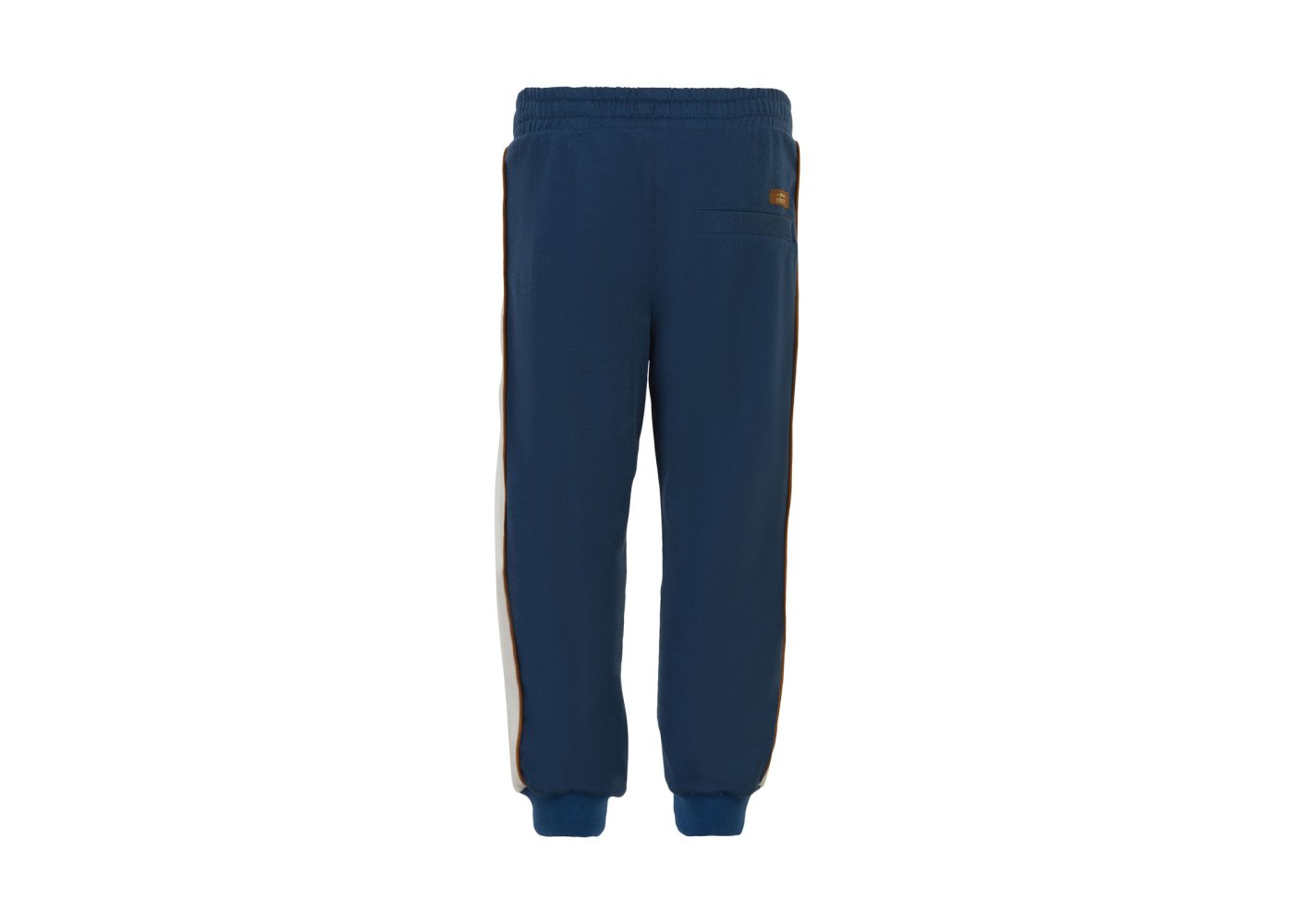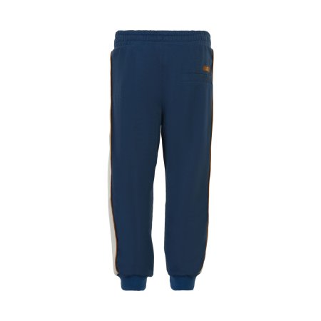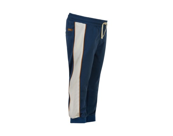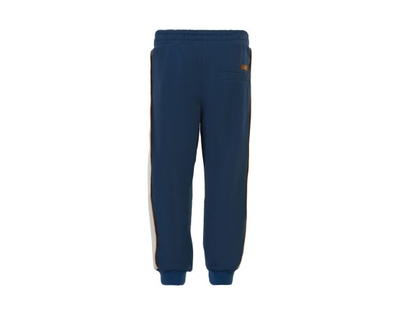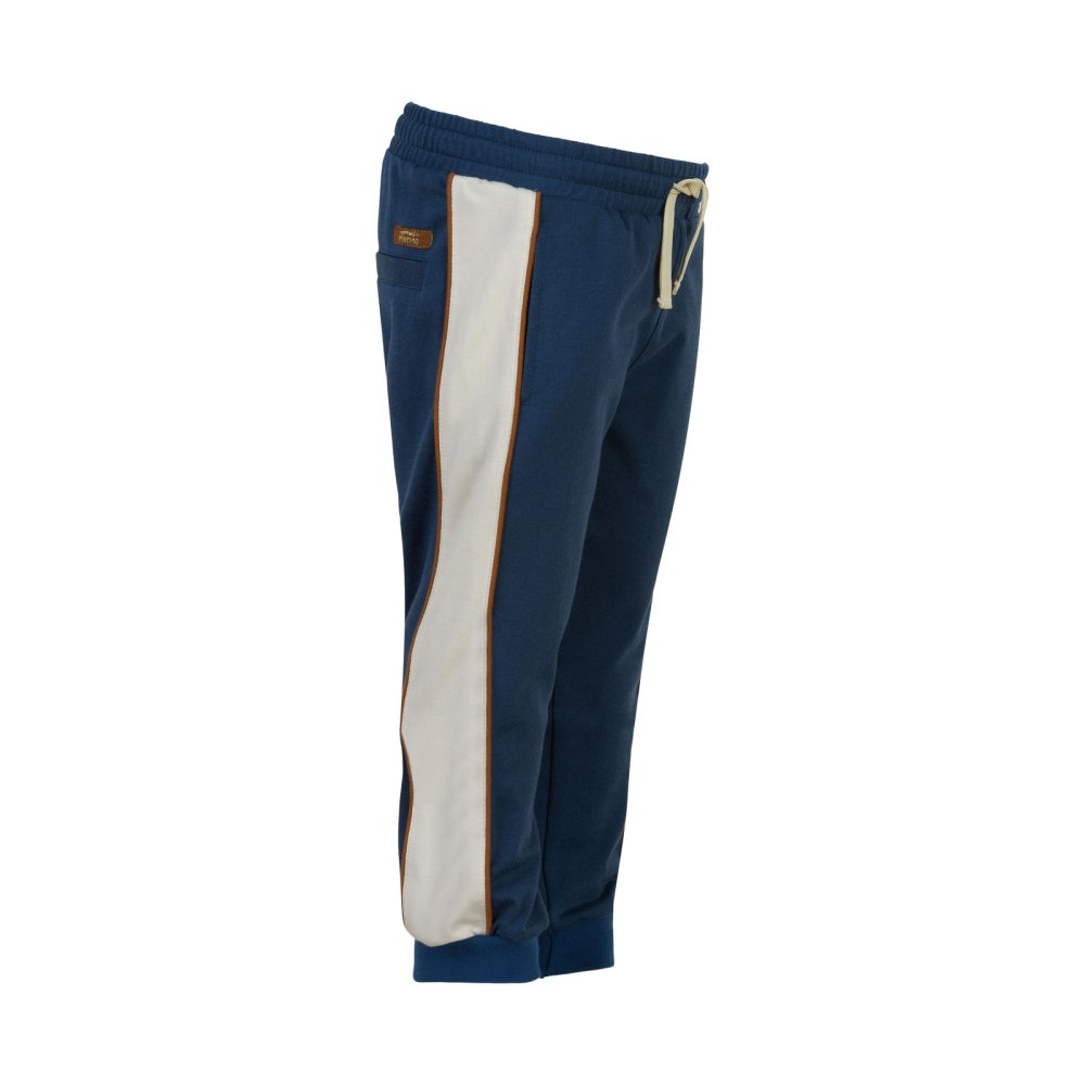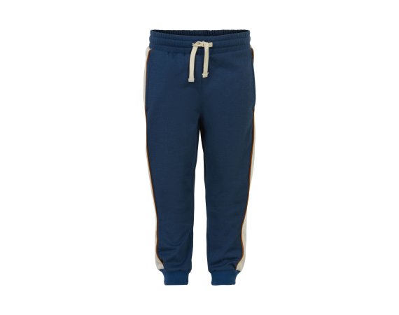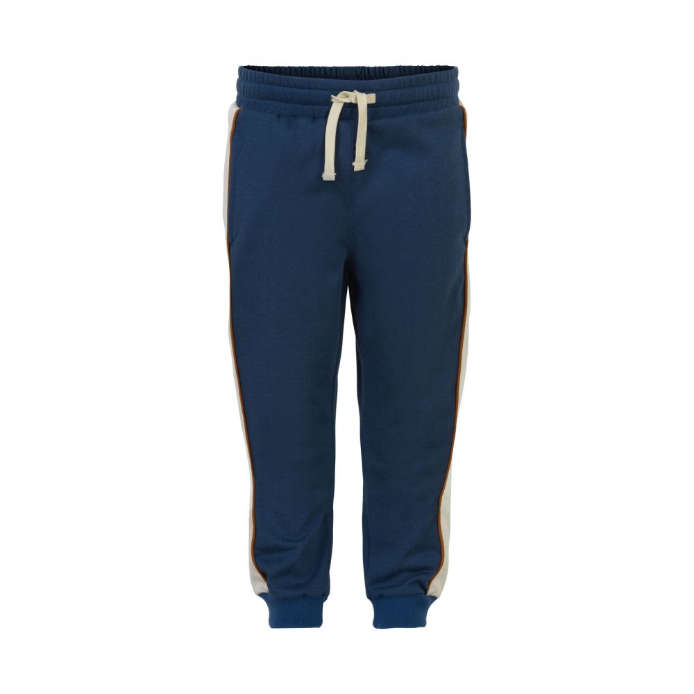 Smarte blå sweatpants med kontrastfarvede striber og pipings på sider fra Minymo.