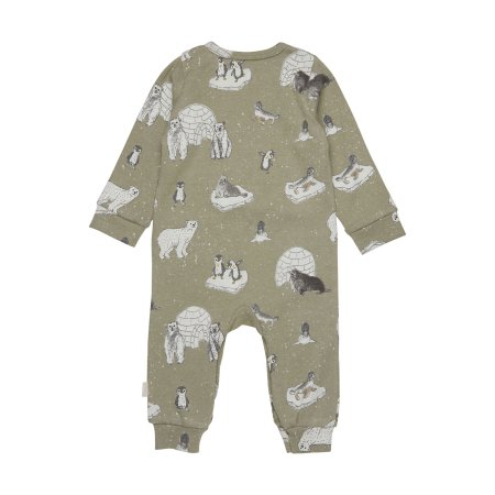 Sød grøn heldragt med smukt motiv af dyr fra Arktis.Heldragten lukkes med stolpelukning og trykknapper imellem ben.Tekstil: 57% bomuld, 38% modal, 5% elastan