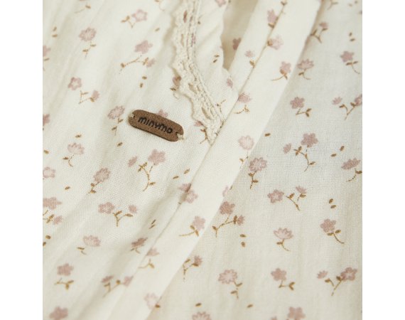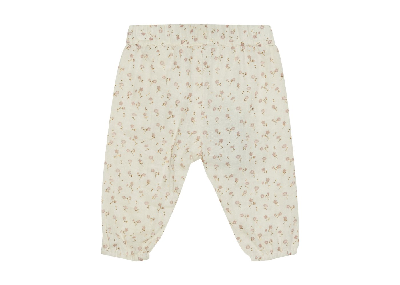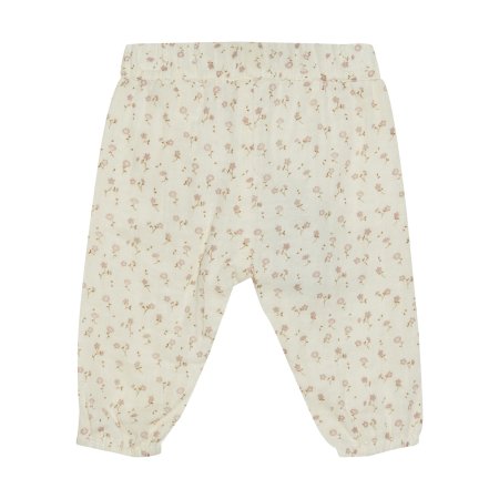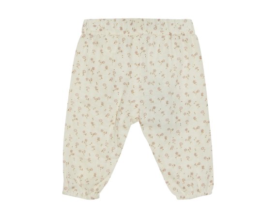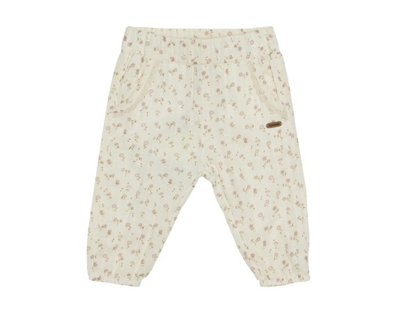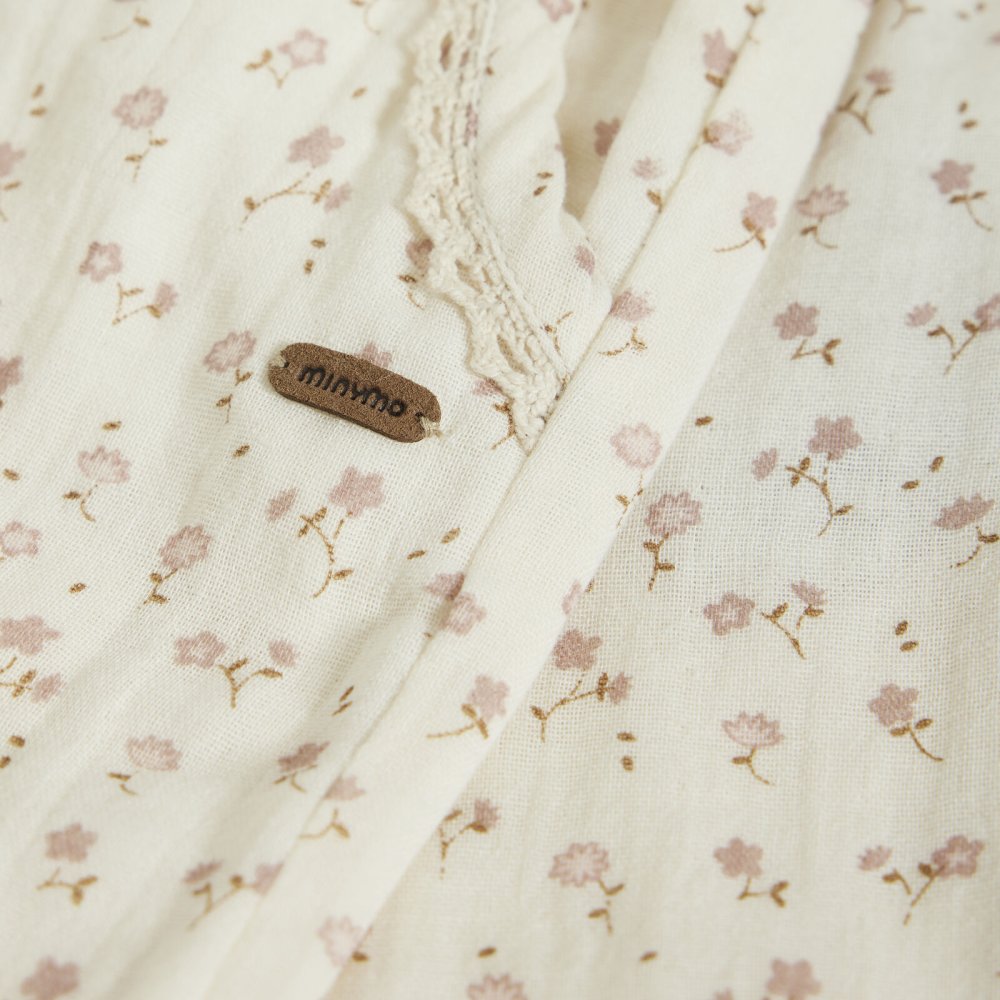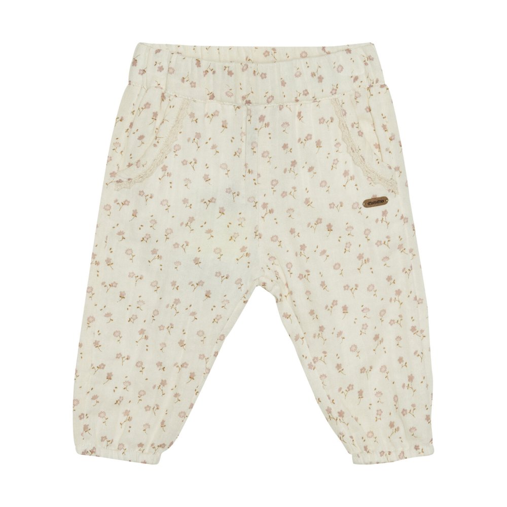 Lækker dobbeltsidet buks med blomster fra Minymo.Buksen har en bred elastik i livet, fin blondekant ved lommer og elastik ved ankler.
