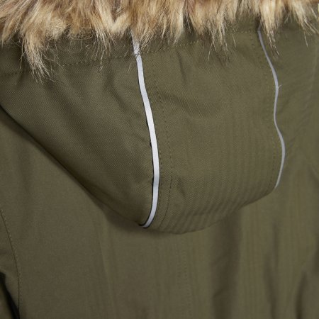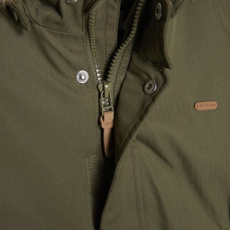 Flyverdragten er foret med en varm og blød fleece. Den har lynlås med dobbelt vindstolpe, hvor den udvendige lukkes med velcro og trykknapper. Den har en aftagelig hætte med fleecefoer og en aftagelig pelskant. Ærmer har et glatvævet foer, og håndled er godt beskyttede med snefang og brede ribkanter.