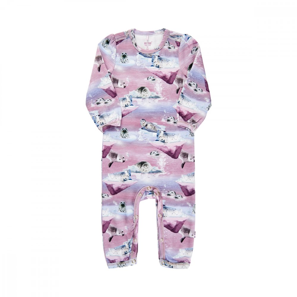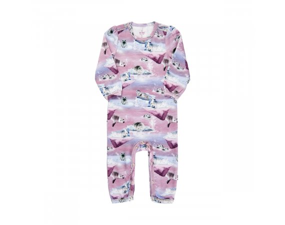 Smart bodysuit med print af sæler Pyntestikninger ved hals, skuldre og håndled. Lukkes med trykknapper på skulder og mellem ben. Heldragten fås i to farver. Tekstil: 95% økologisk bomuld, 5% Elastane