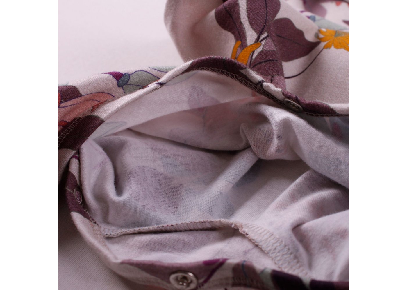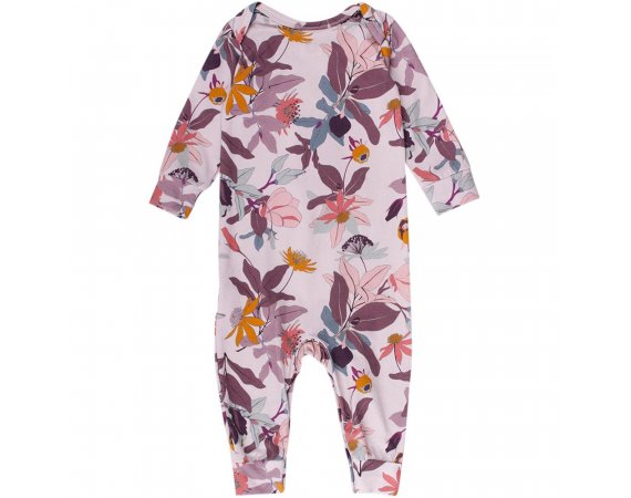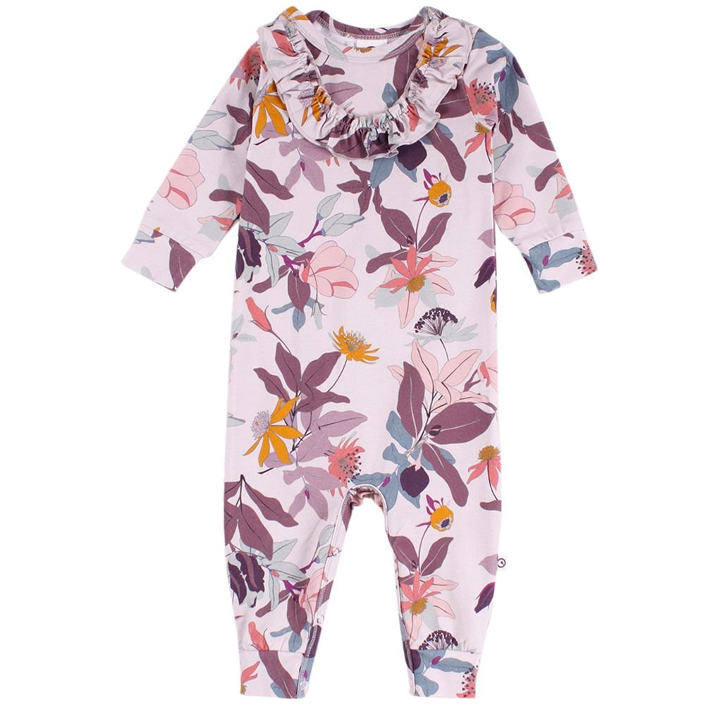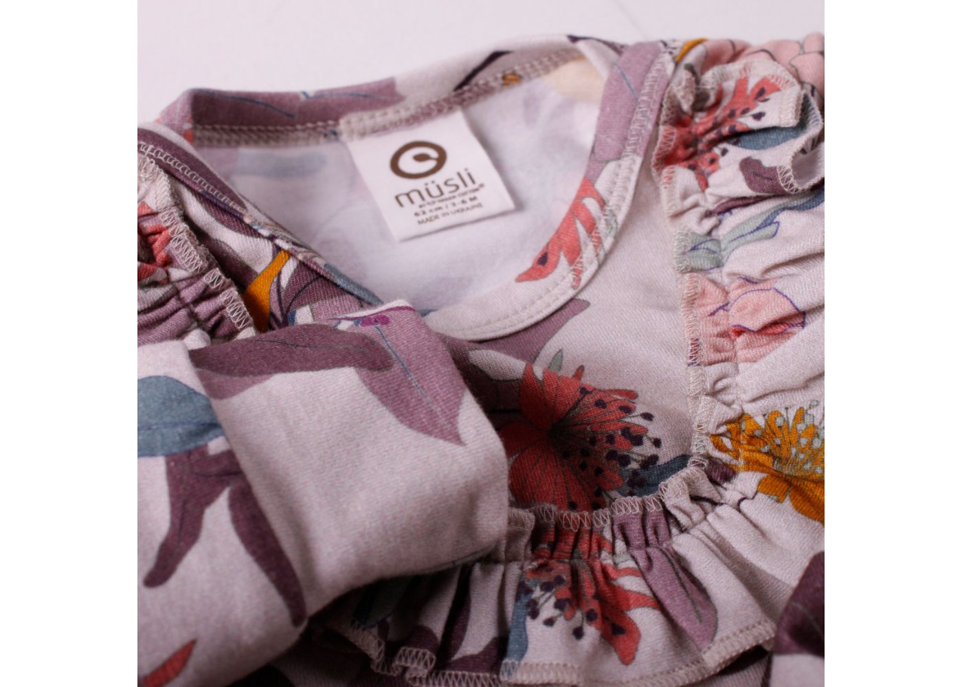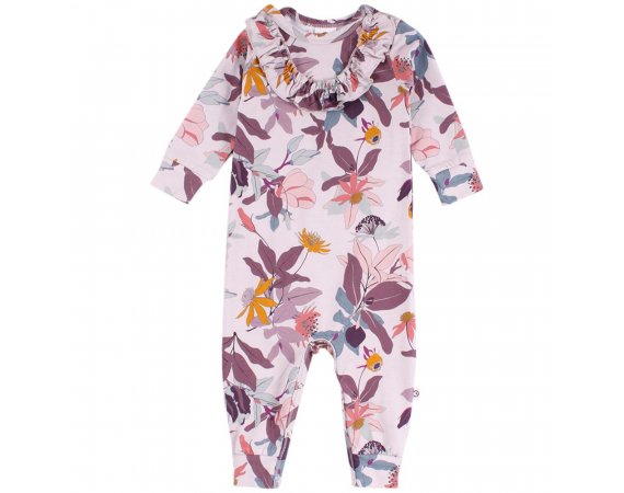 Super sød heldragt med blomsterprint.Dragten har kuvertlukning og en sød flæse foran på brystet, der giver den et flot look.