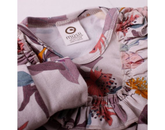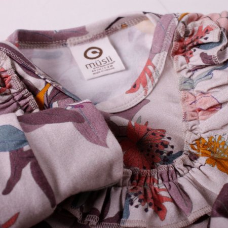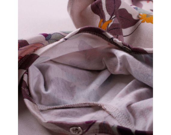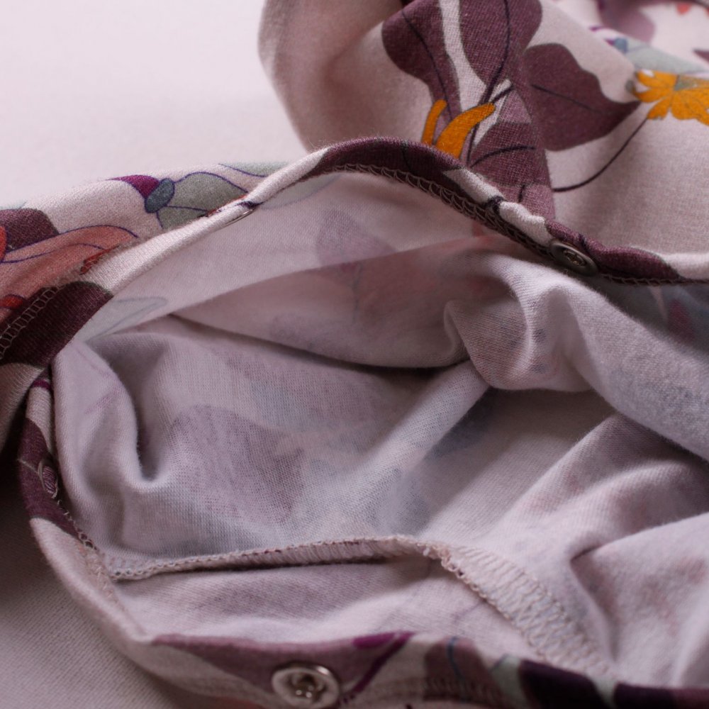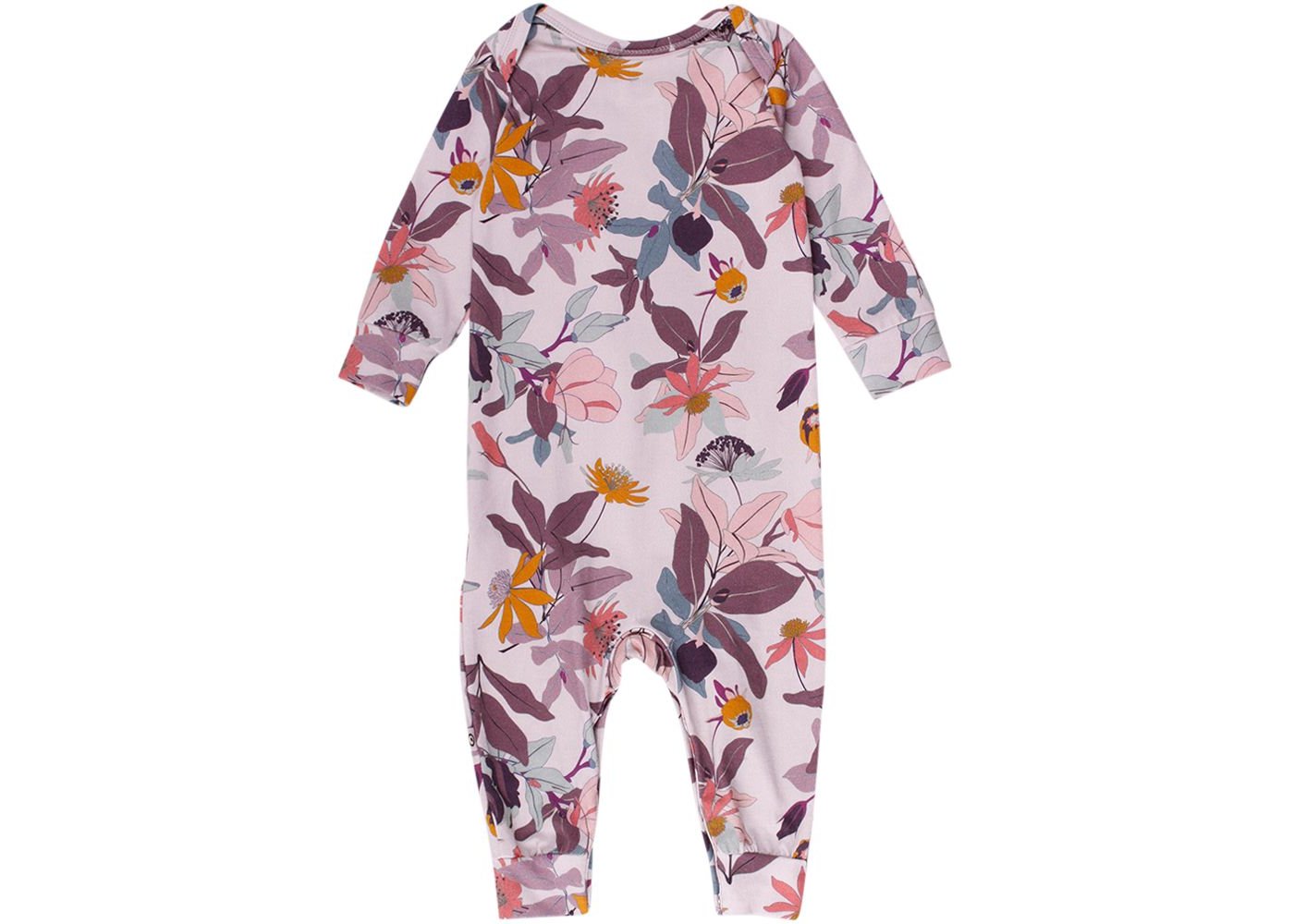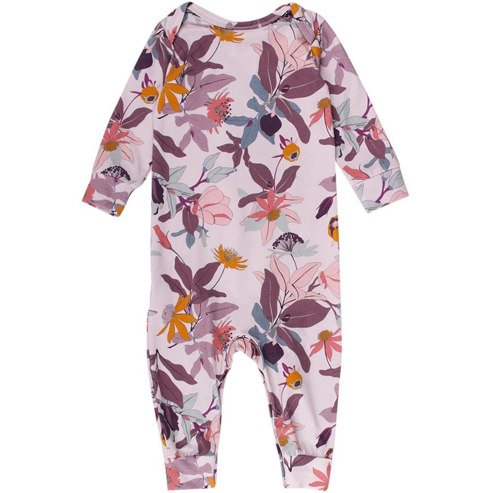 Super sød heldragt med blomsterprint.Dragten har kuvertlukning og en sød flæse foran på brystet, der giver den et flot look.