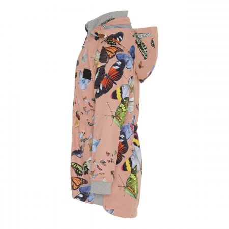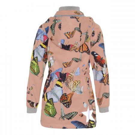 Smart og vandtæt softshell jakke med sommerfugle printJakke med lynlås ned langs fronten, indvendig vindstoppe og hagebeskytter.