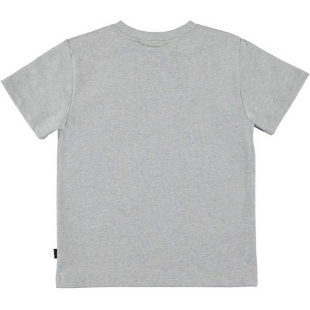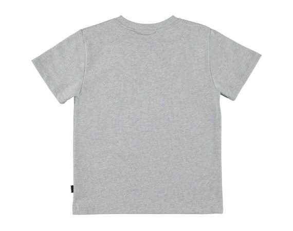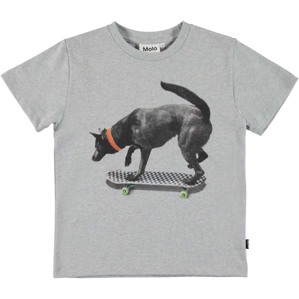T-shirten er pyntet med en ulv, der kører på skateboard. T-shirten er ensfarvet grå bagpå.