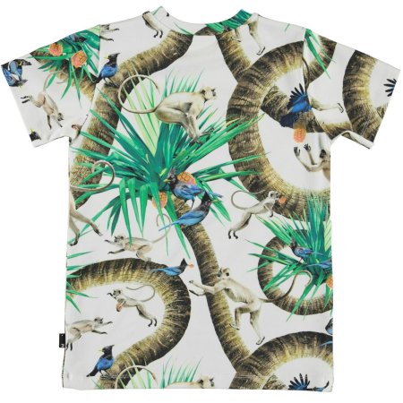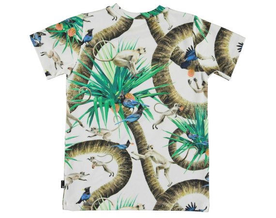T-shirten er pyntet med palmer, aber og vilde fugle både foran og bagpå.