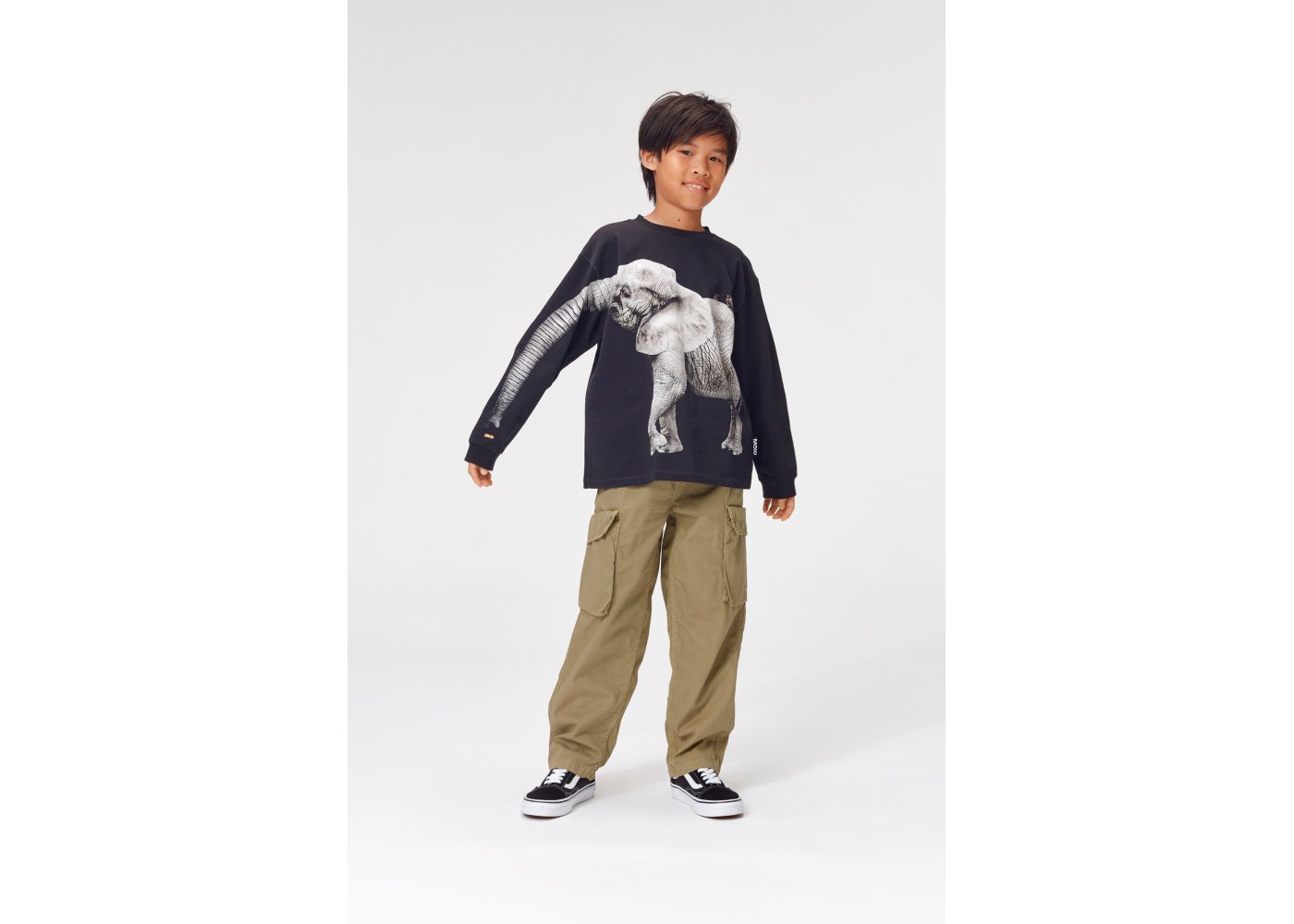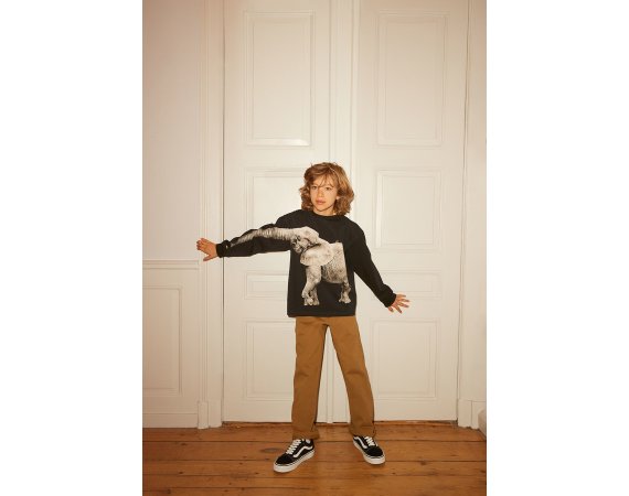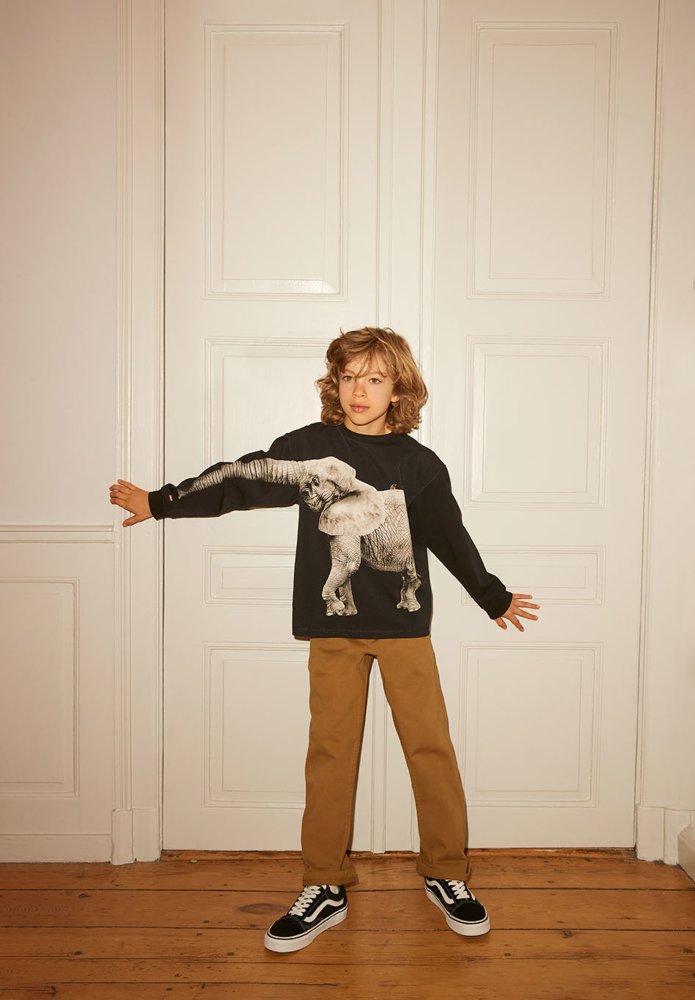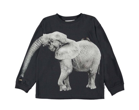 T-shirten er flot pyntet med en grå elefant med en lang snabel. Snablen er aftegnet på T-shirtens ærme og giver en sjov effekt, når armen løftes i vejret.