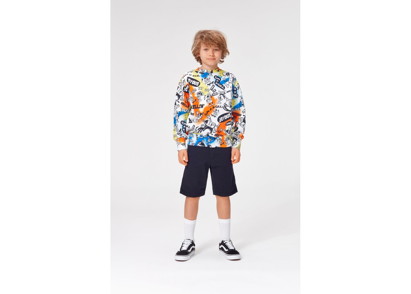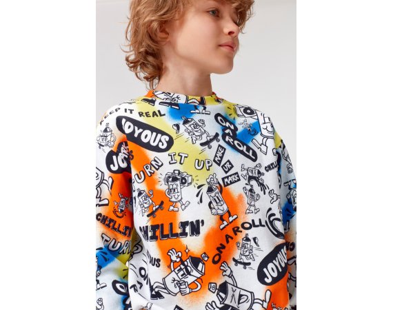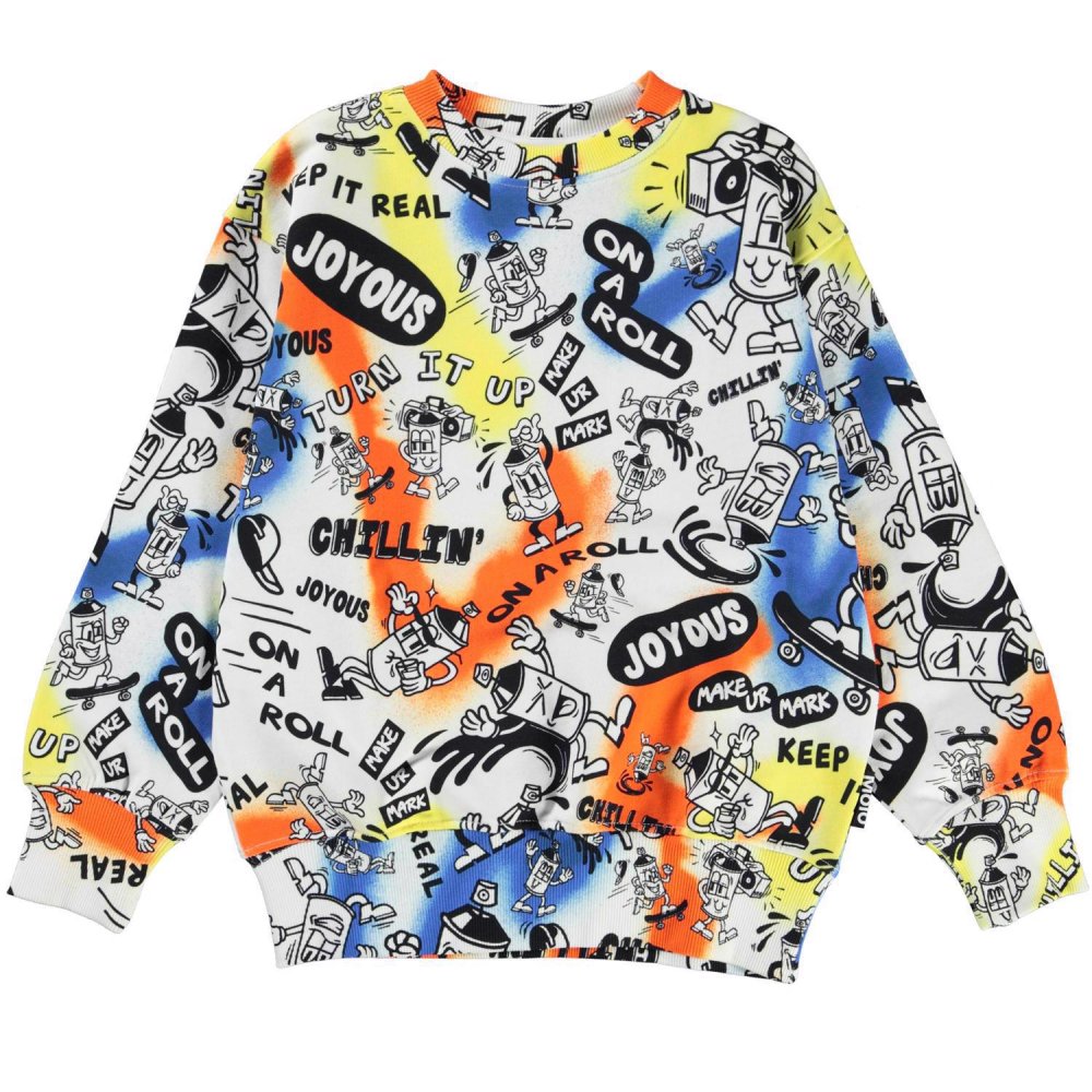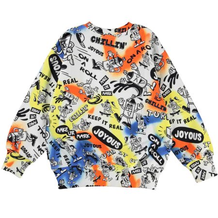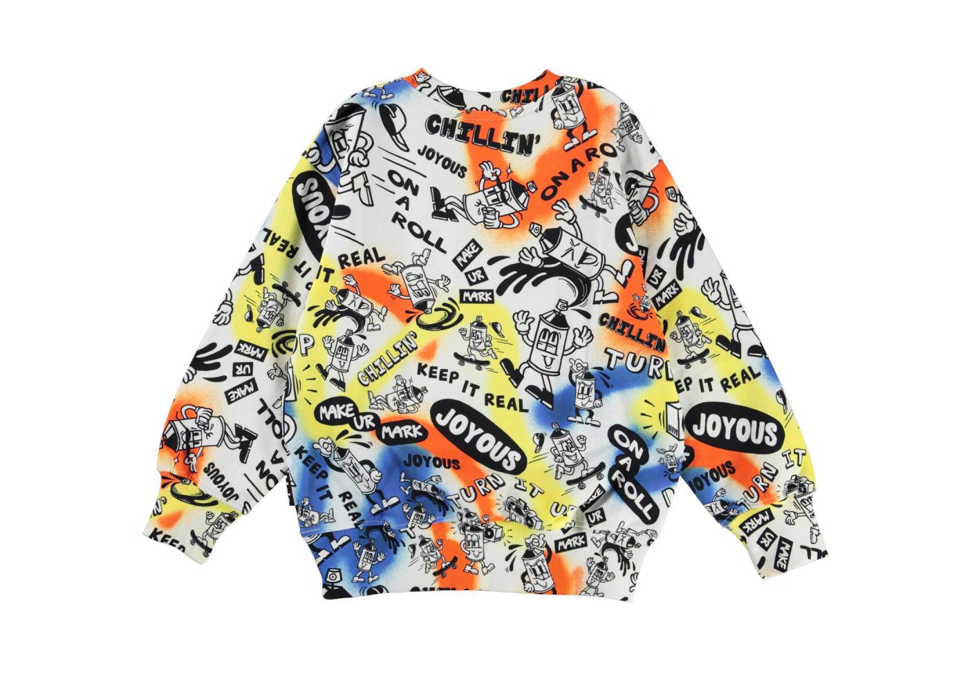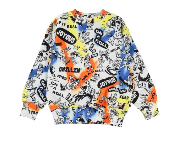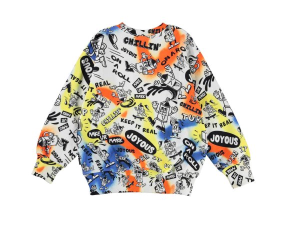 Sweatshirten har ribkanter i alle åbninger, og er fyldt med sjove tegneseriefigurer.