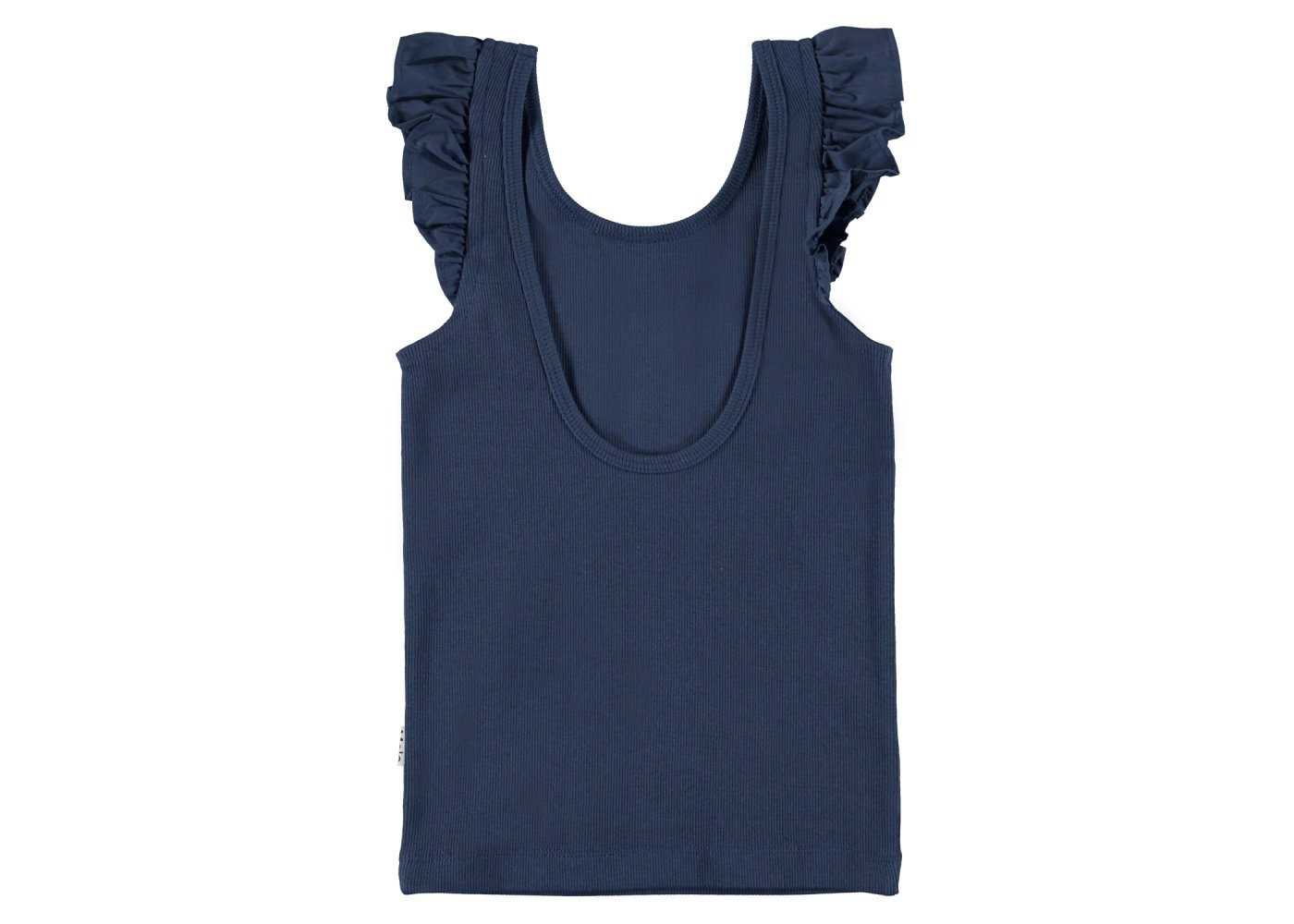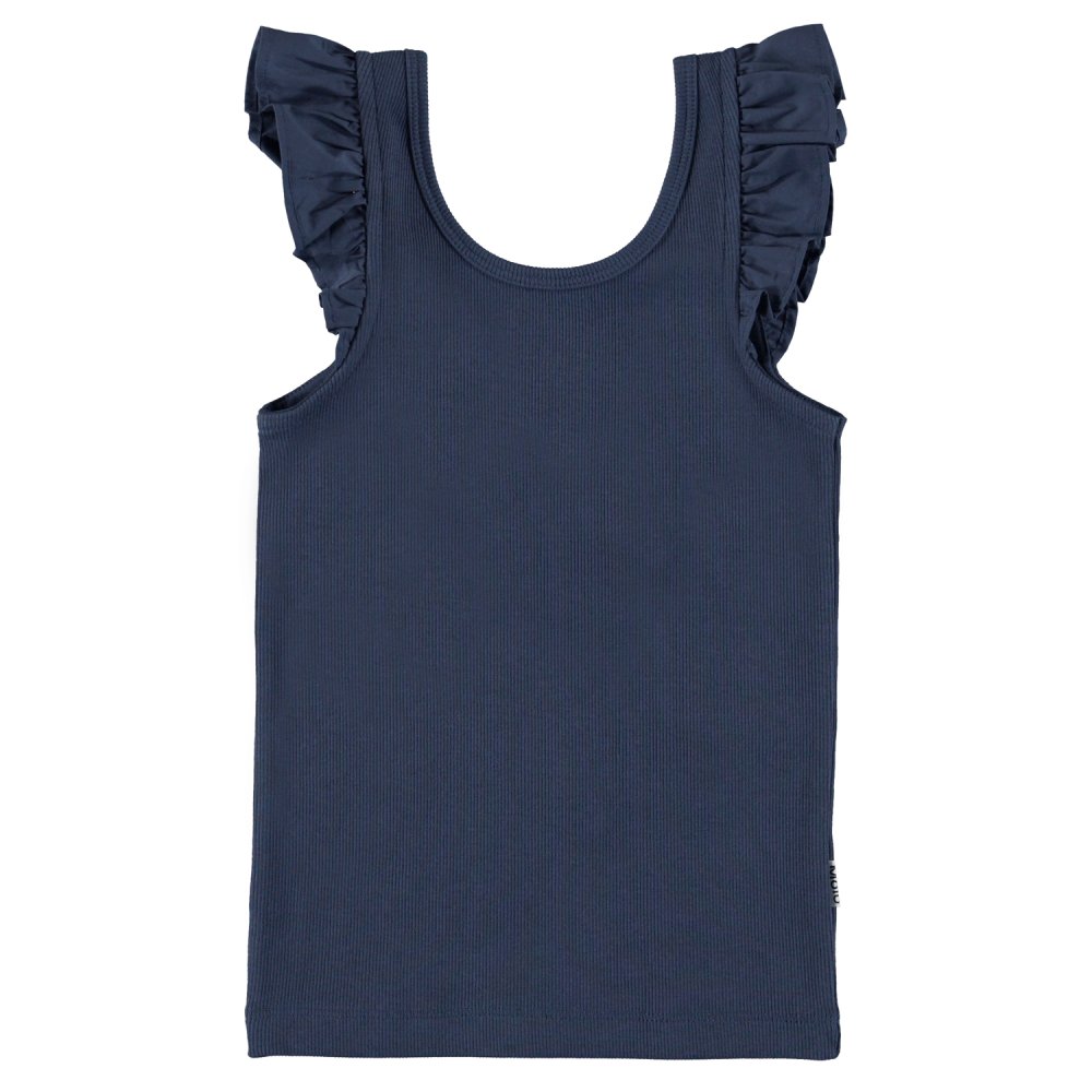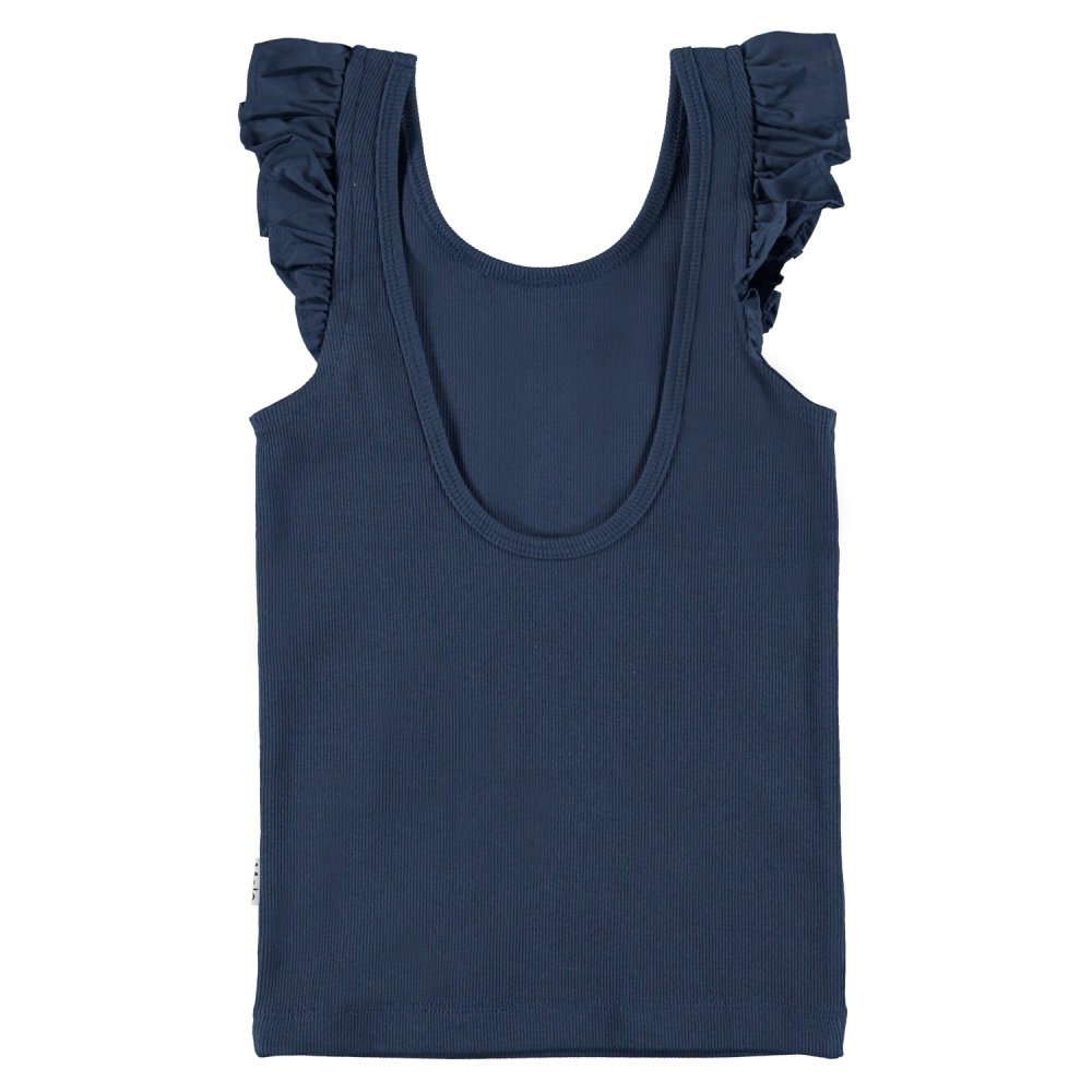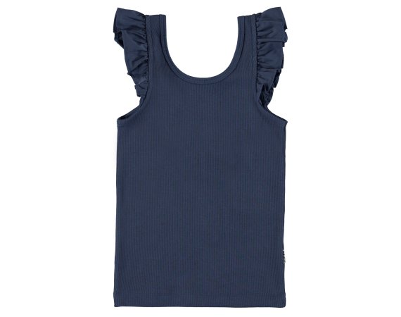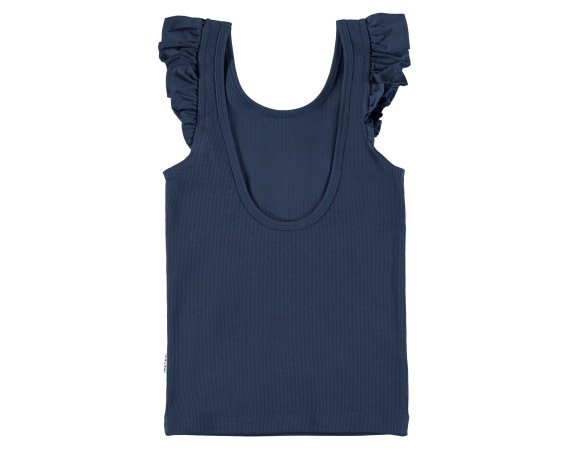 Toppen har ribkant i halsudskæring og er uden ærmer. Den er nedringet bagpå, og har de fineste flæser på skuldre.
