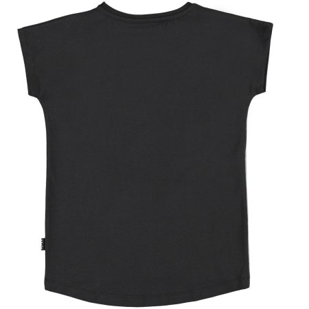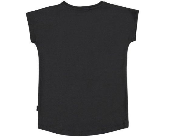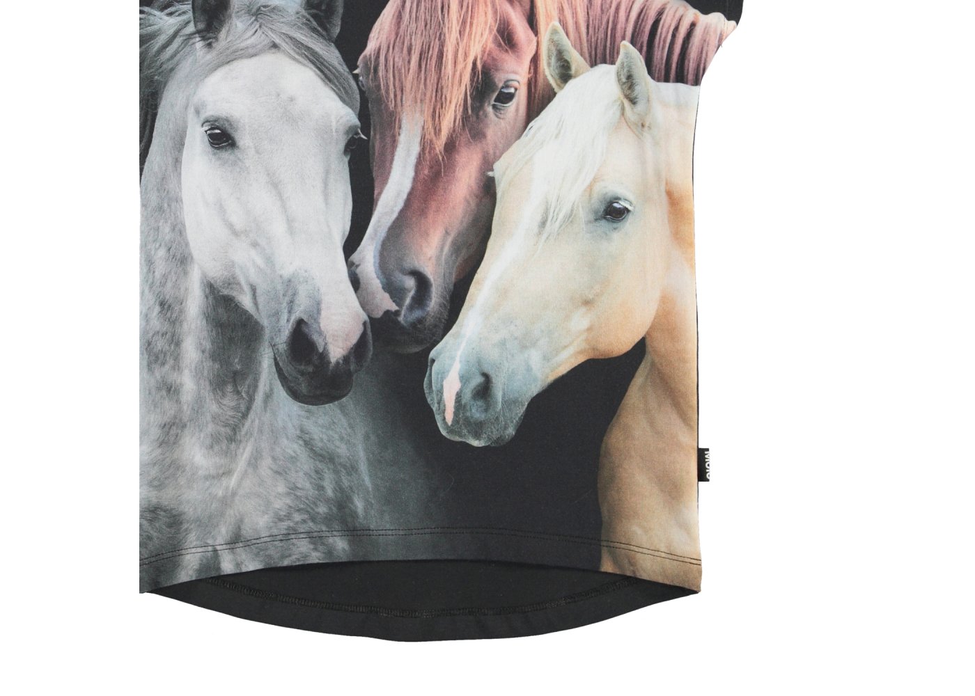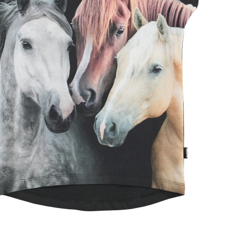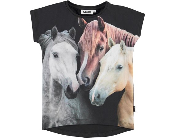 T-shirten har rund halsudskæring, meget korte ærmer og går lidt længere ned bagpå. Den er pyntet med tre flotte heste foran og bagsiden er ensfarvet sort. En smuk t-shirt som enhver hestepige vil elske at have på.