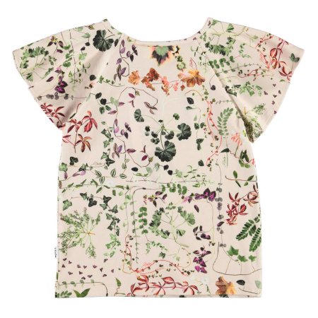 T-shirten har en rund halsudskæring med rynk og raglanærmer med flot og luftig vidde. Den er pyntet med flotte blomster i grønne, lilla, røde og gule nuancer.
