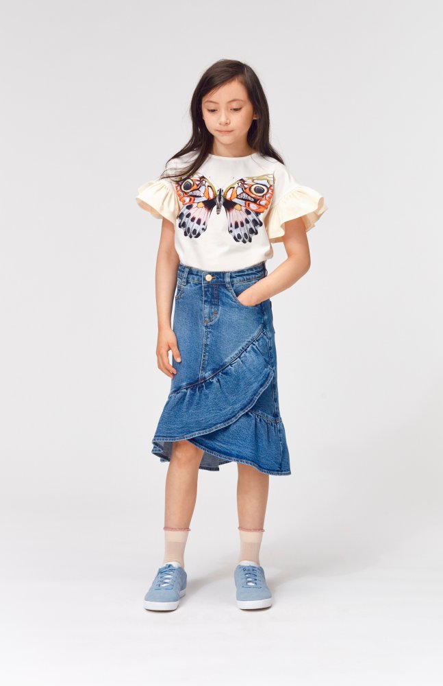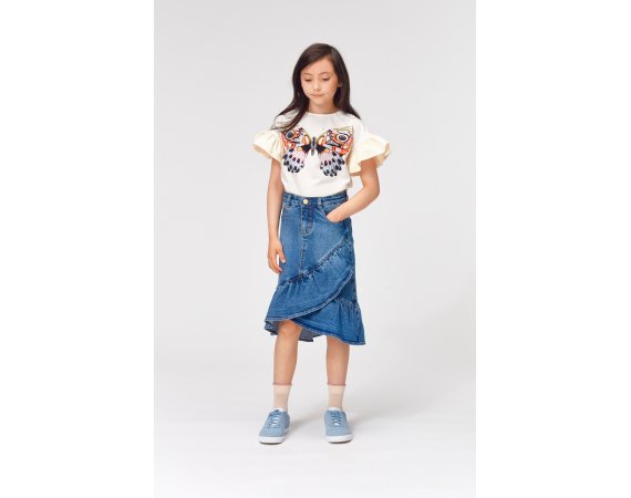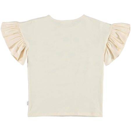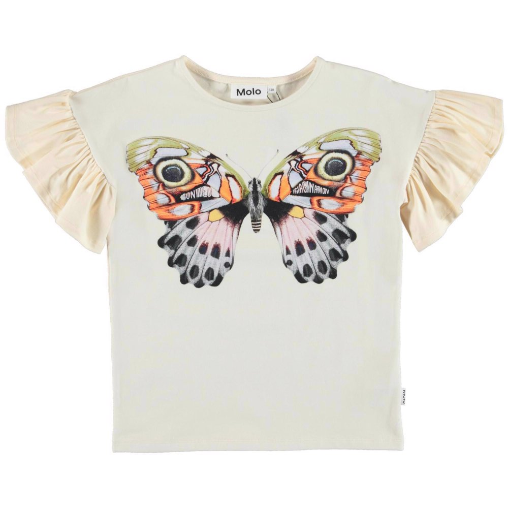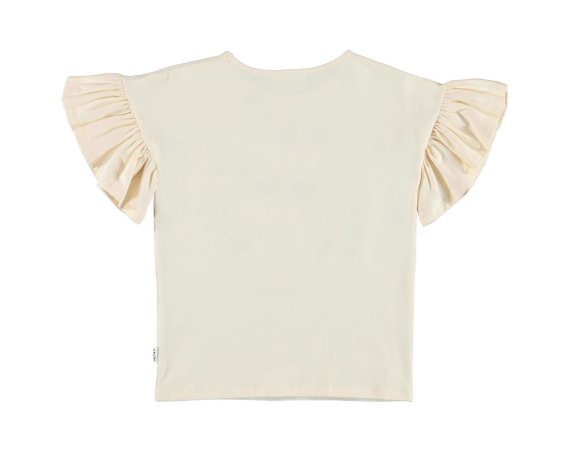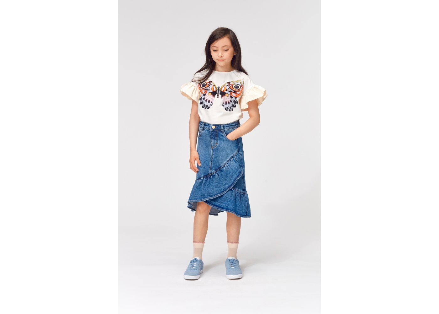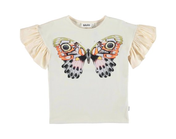 Super sød kortærmet t-shirt med en flot sommerfugl foran og de fineste, rynkede flæseærmer. T-shirten er ensfarvet bagpå og vil passe rigtig fint sammen med en nederdel.