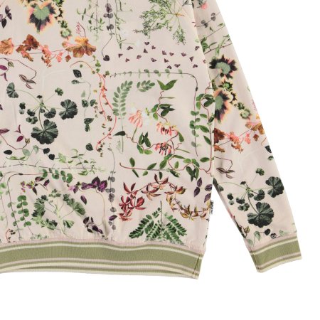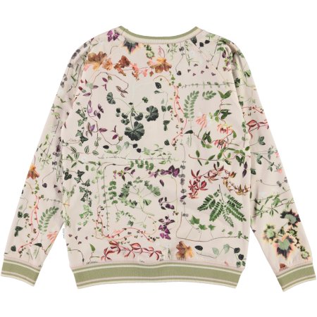Blusen er pyntet med flotte blomster i grønne, lilla, røde og gule nuancer.
