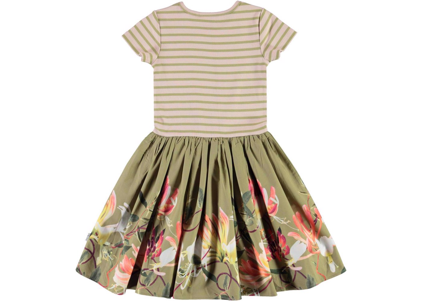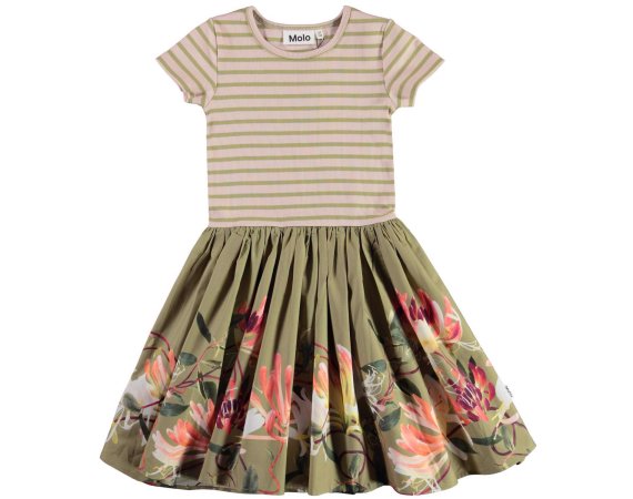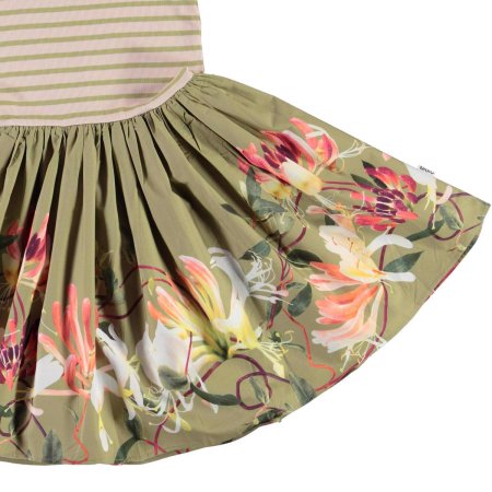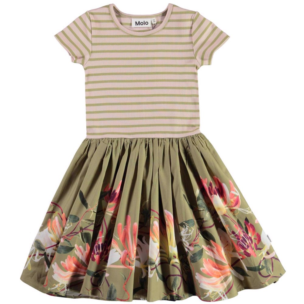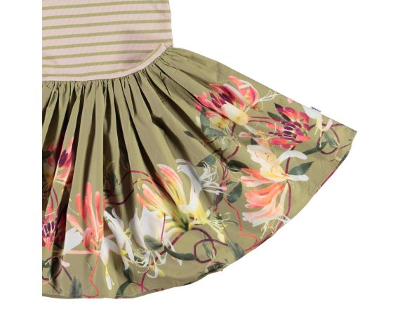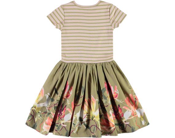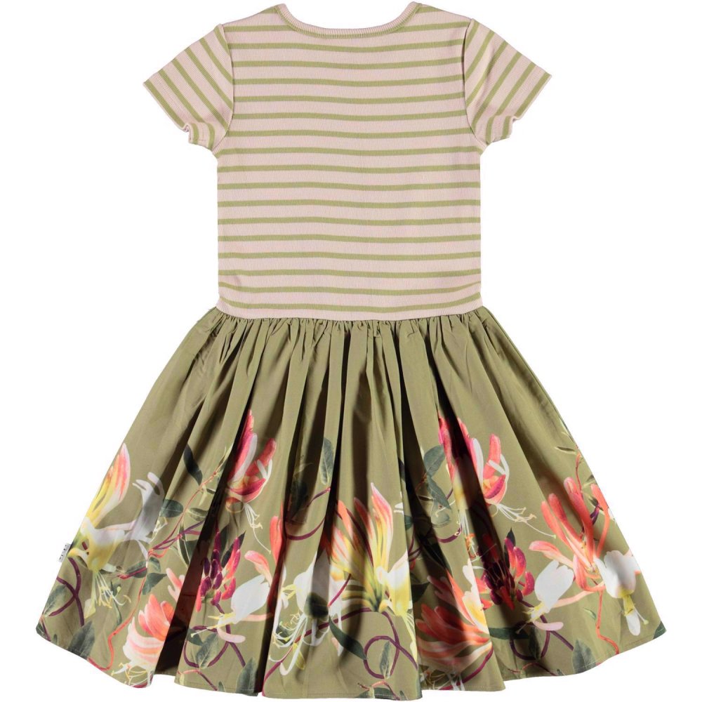 Skøn todelt kortærmet kjole med stribet rib overdel. Skørtet er grønt og pyntet med kaprifolier i smukke farver.