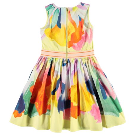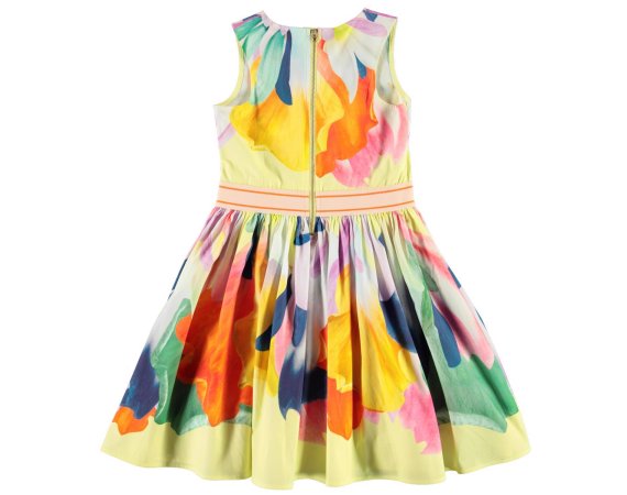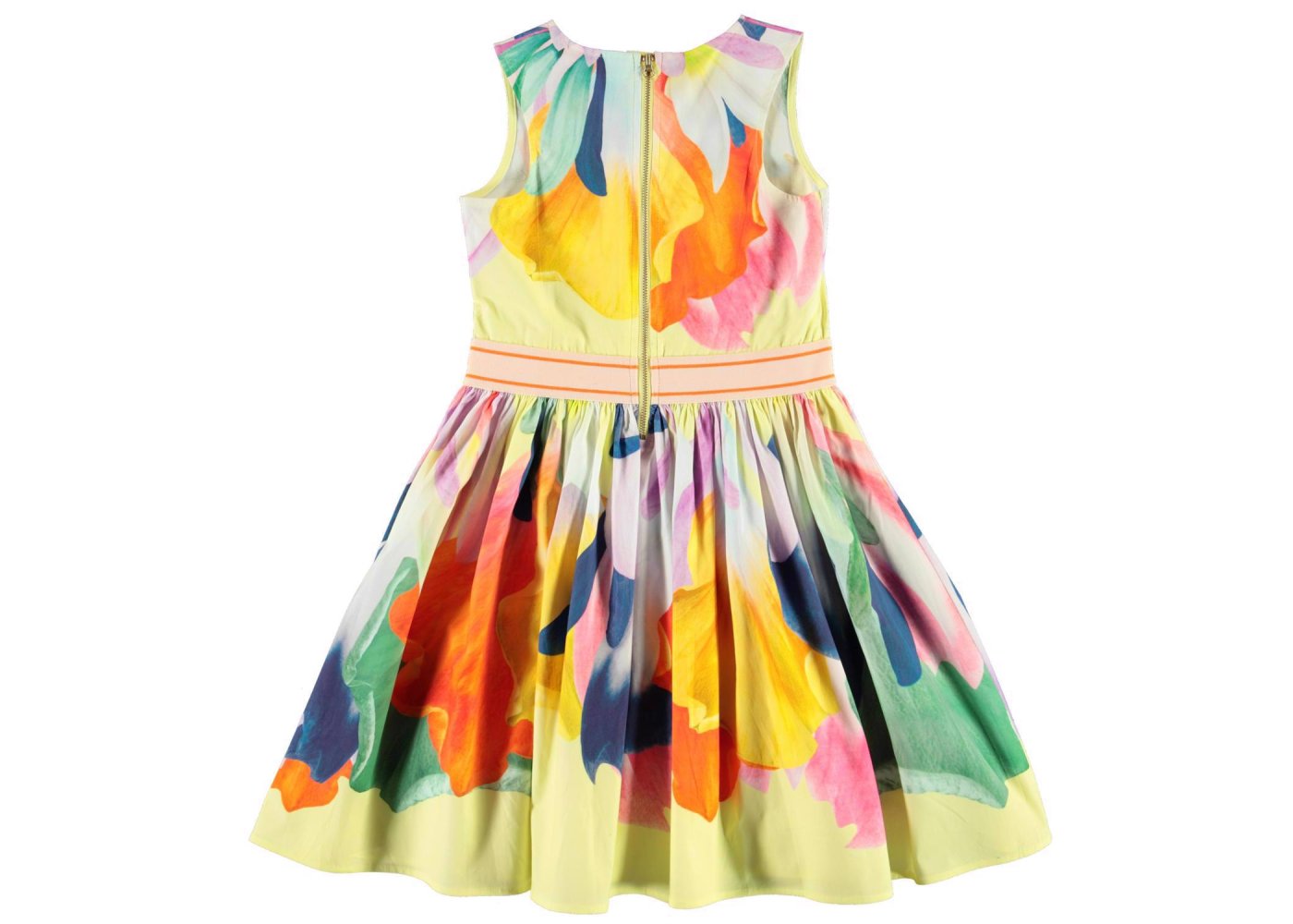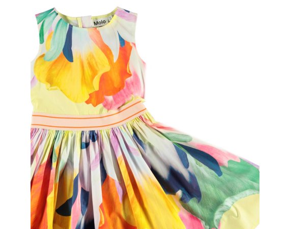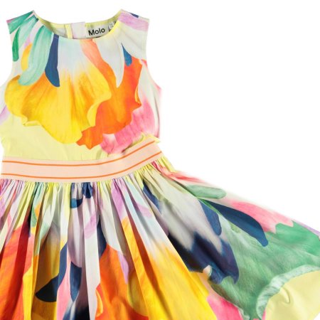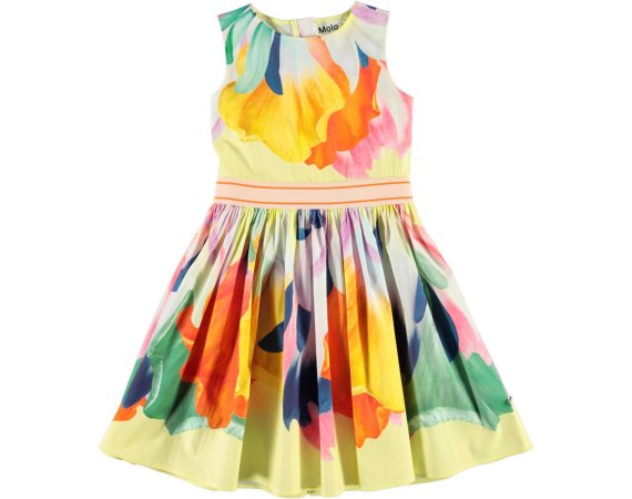 Kjolen er uden ærmer og pyntet med de flotteste, farverige blomster.