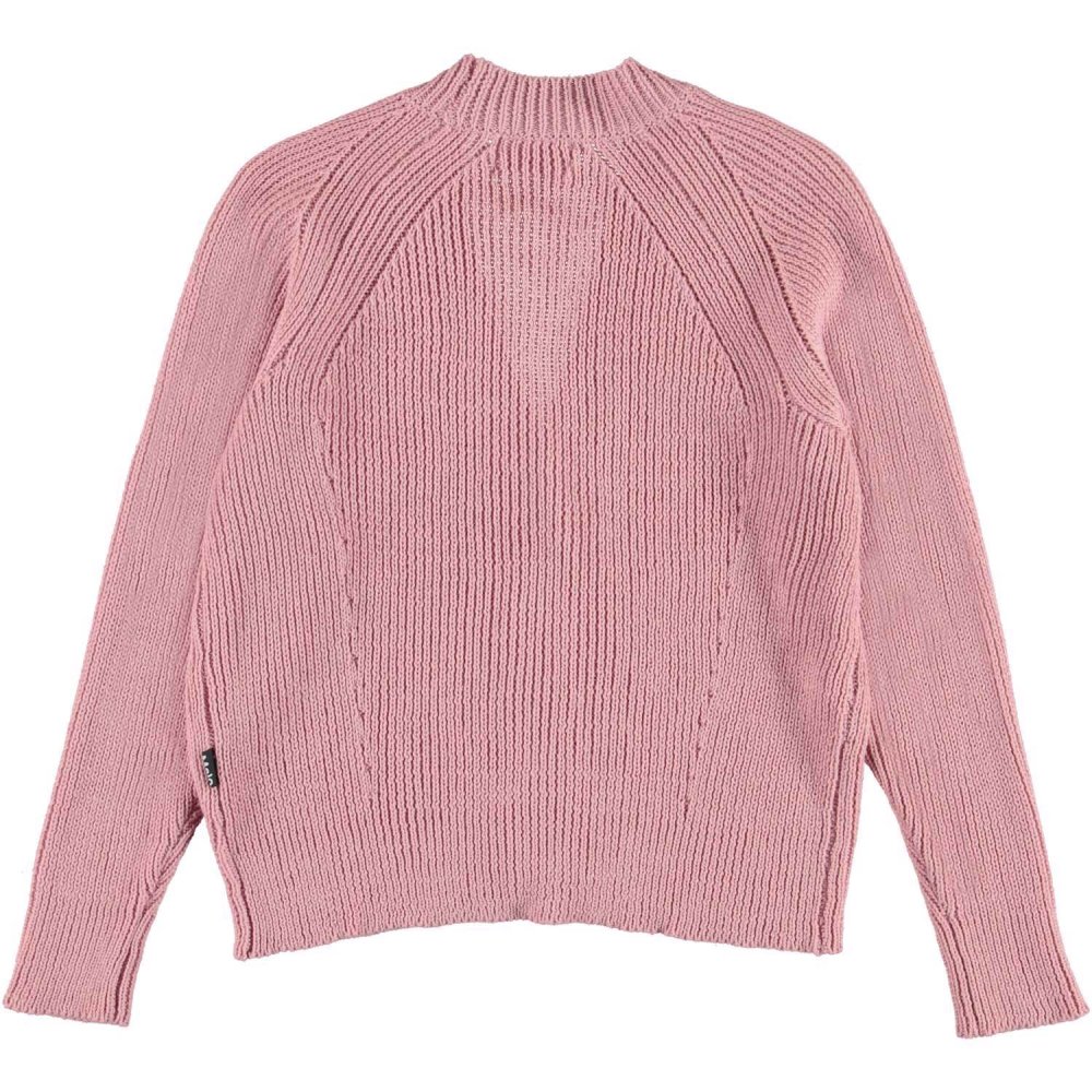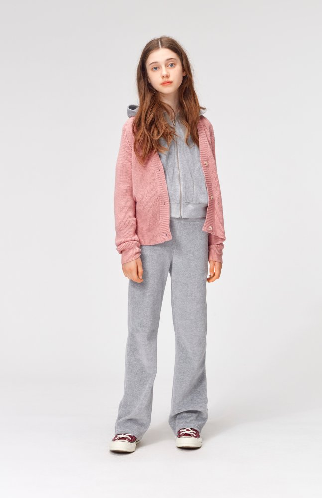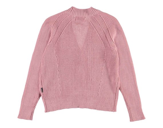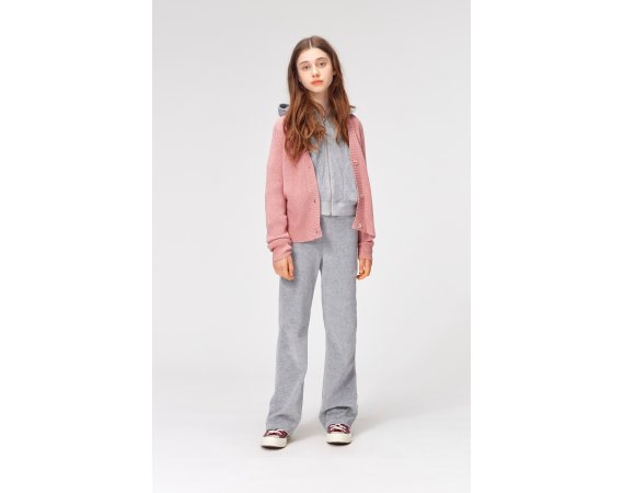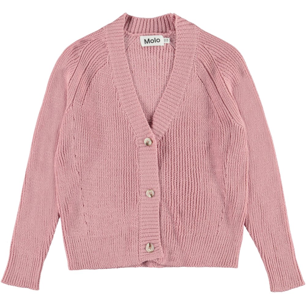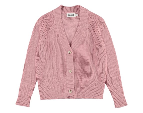 Cardiganen har V-udskæring og lukkes med knapper ned foran. Den har ribkanter i alle åbninger, raglanærmer og en kort pasform.