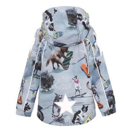 Skøn blå jakke med hunde der står på skateboard fra Molo.