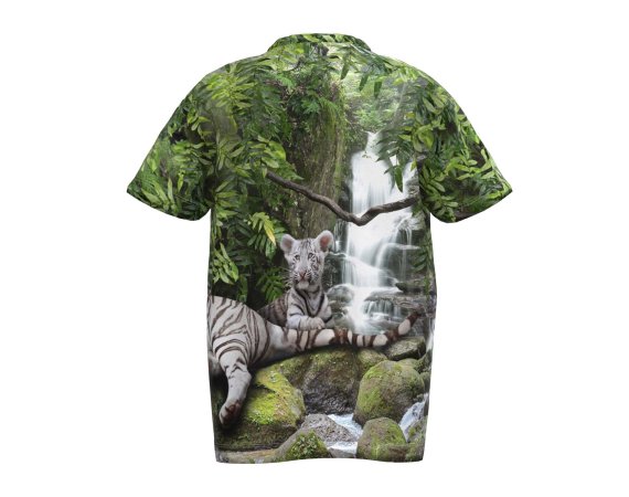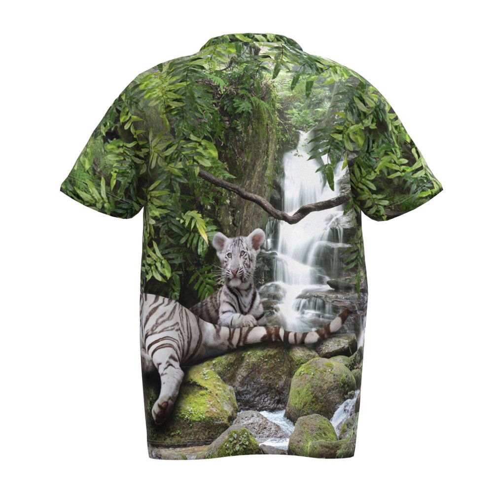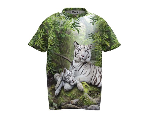 T-shirten er grøn og pyntet med flotte hvide tigre bøde foran og bagpå.