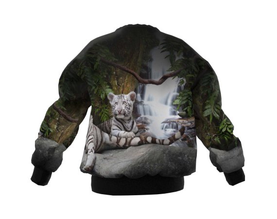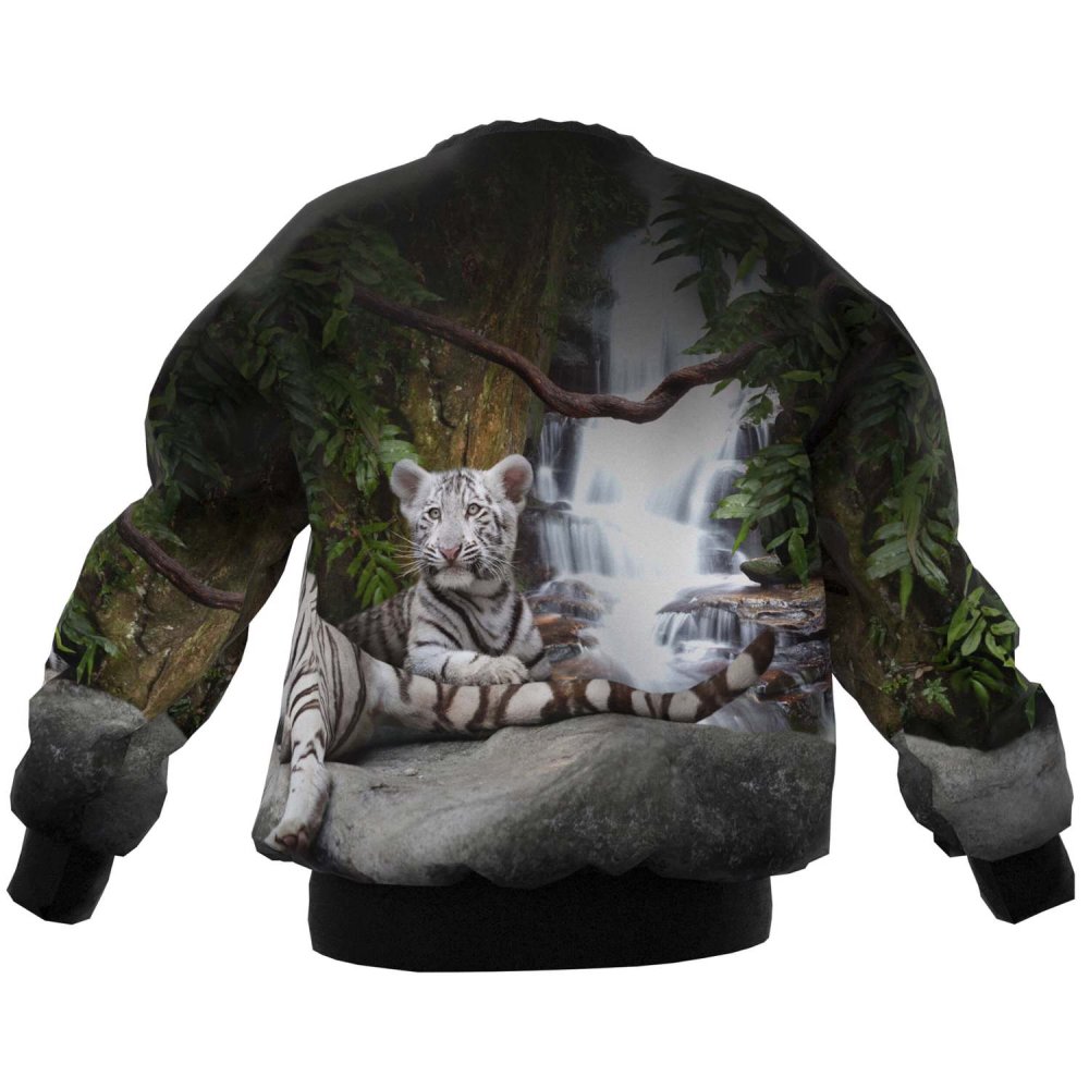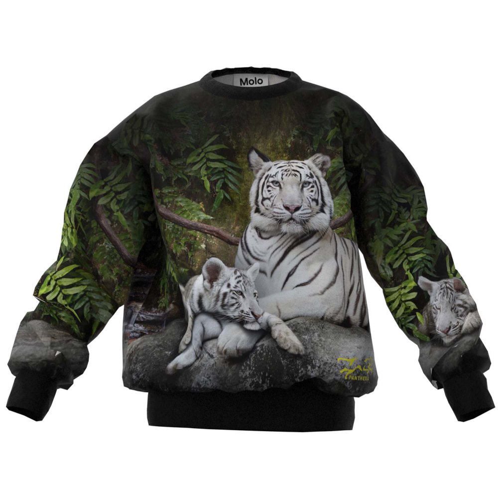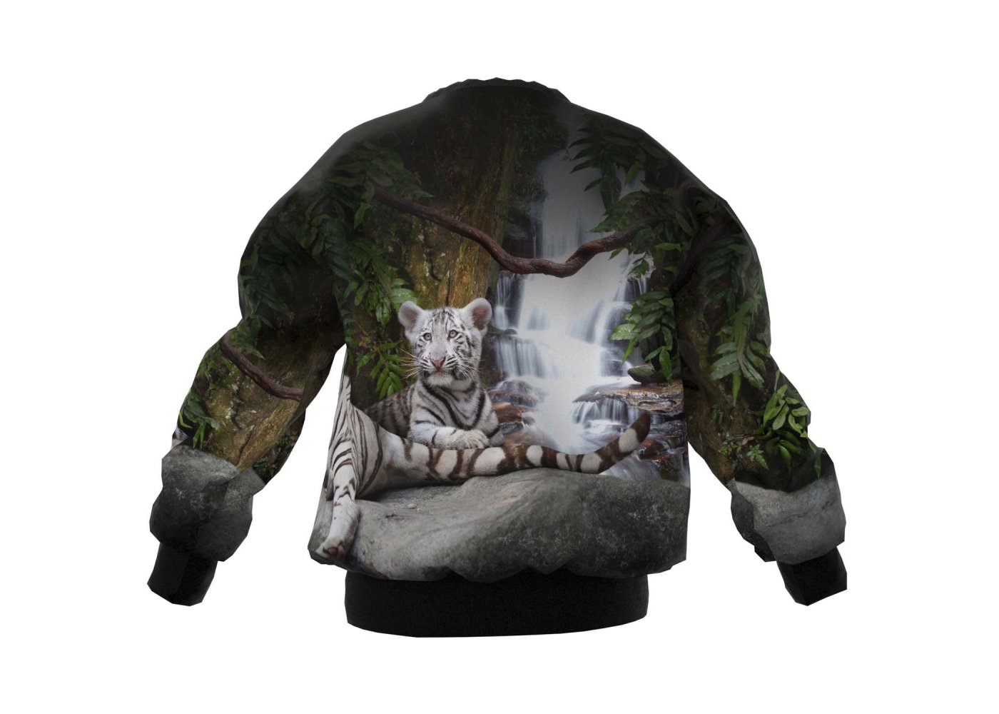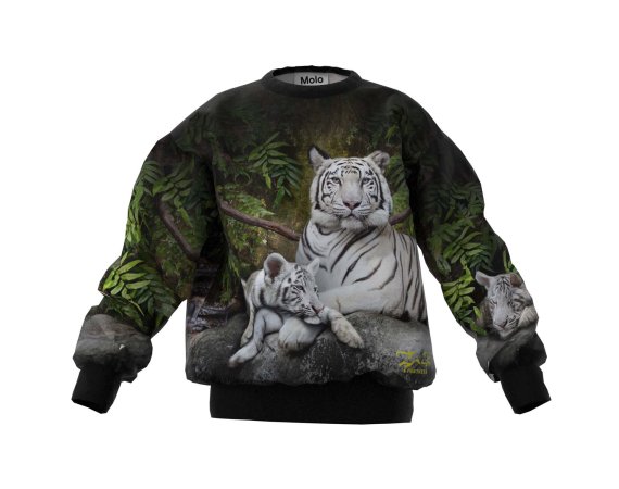 Sweatshirten er pyntet med de fineste hvide tigre. Den har sorte ribkanter i alle åbninger.