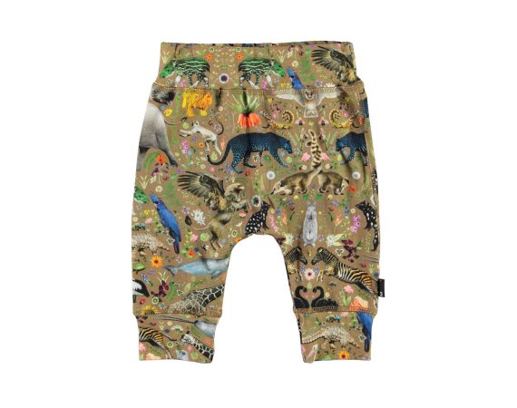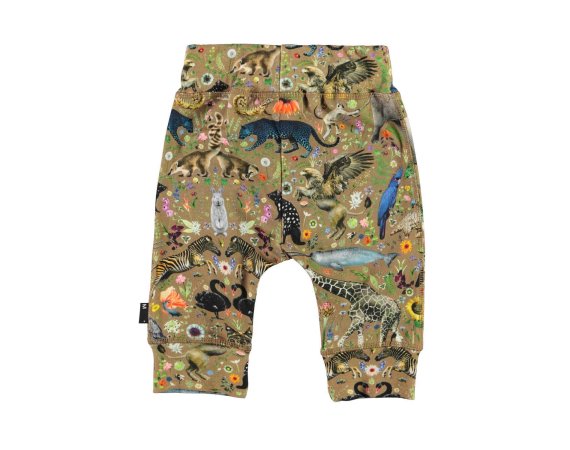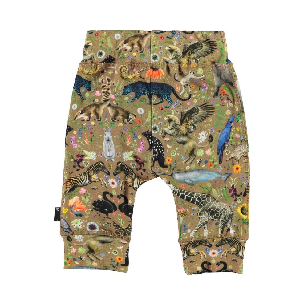 Lysebrune babybukser med flot surrealistisk dyre- og planteprint fra Molo.