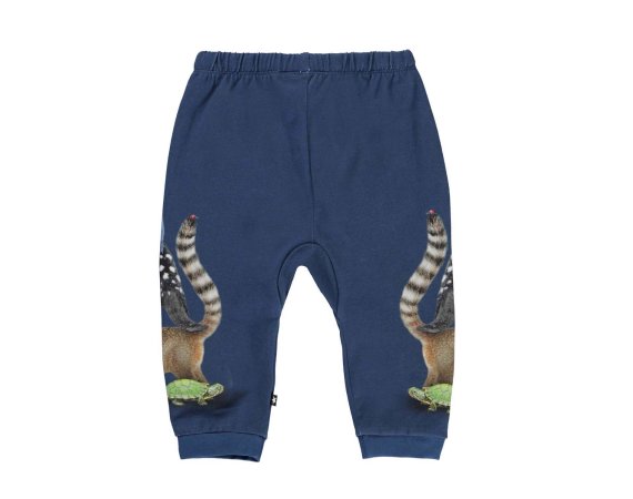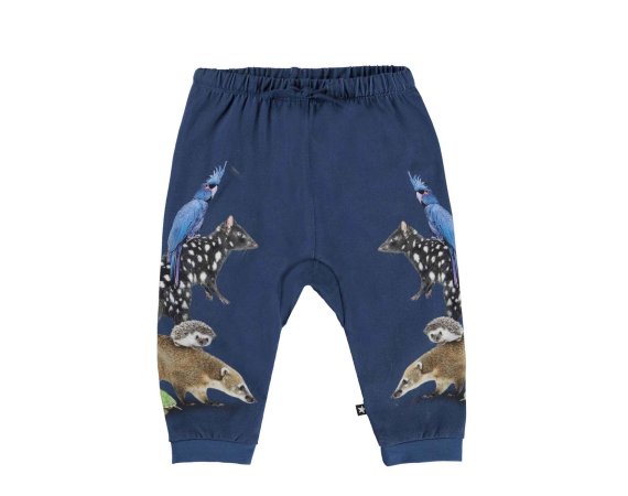Skønne blå babybukser med papegøje, pindsvin og andre søde dyr fra Molo.