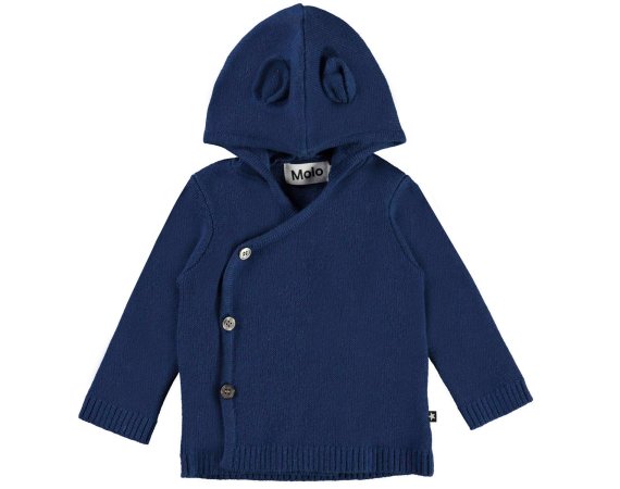 Lækker strik cardigan i blå med sjove små ører på hætten fra Molo.
