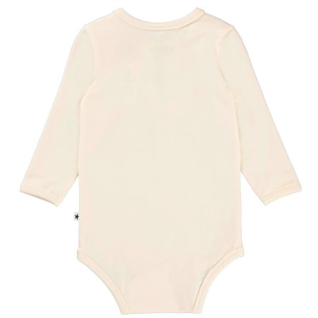 Bodyen har lange ærmer, og er ensfarvet bagpå. Den har ribkanter i alle åbninger og lukkes med trykknapper på skuldre og imellem ben.