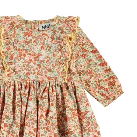 Chocho er en blomstret baby kjole med lange ærmer med elastik ved håndled og flæser på overdelen. Kjolen har rynk i livet, som giver skørtet fylde.
