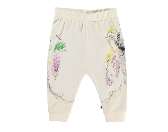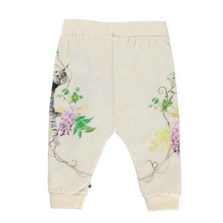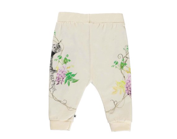 Her får du et par rummelige babybukser med søde kattekillinger, der klatrer og leger imellem blomster. Bukserne har elastik i livet og brede ribkanter ved ankler.