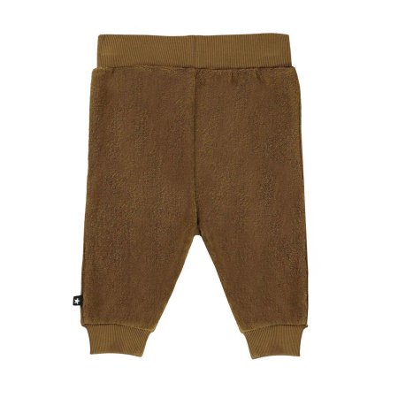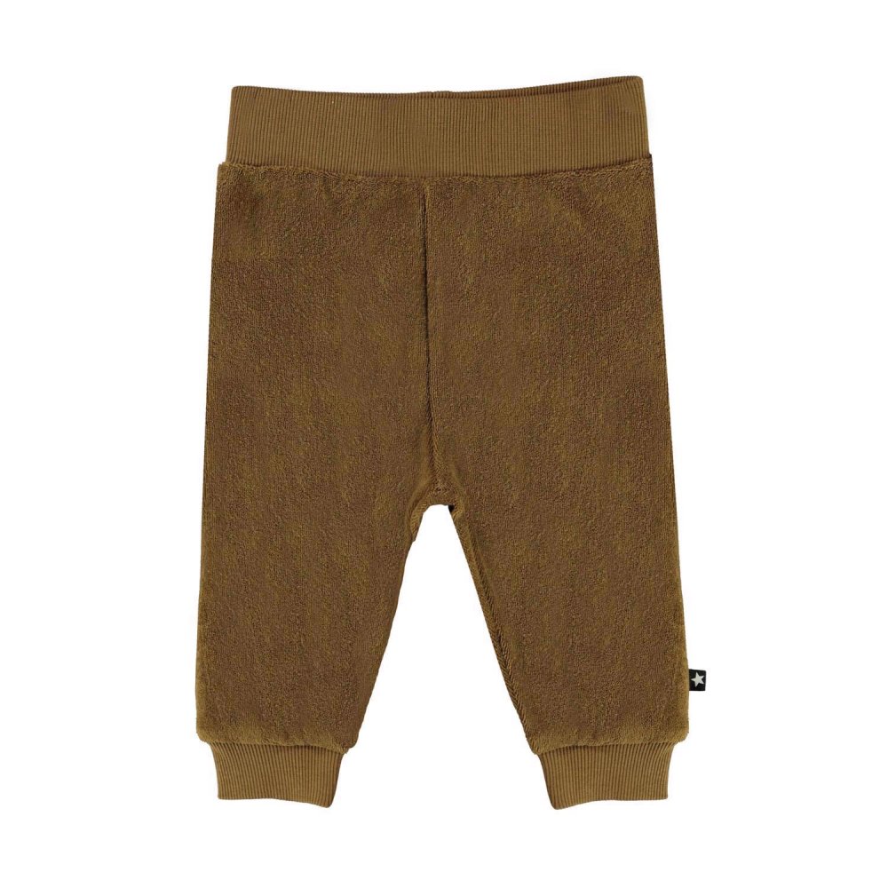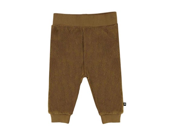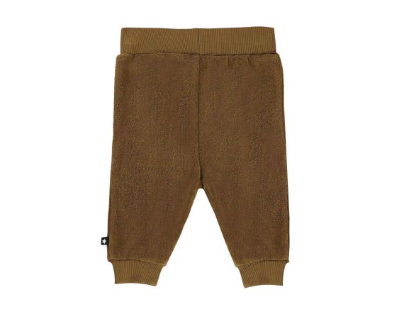 Buksen har et loos fit, brede ribkanter ved ankler og elastik og bindebånd i livet.