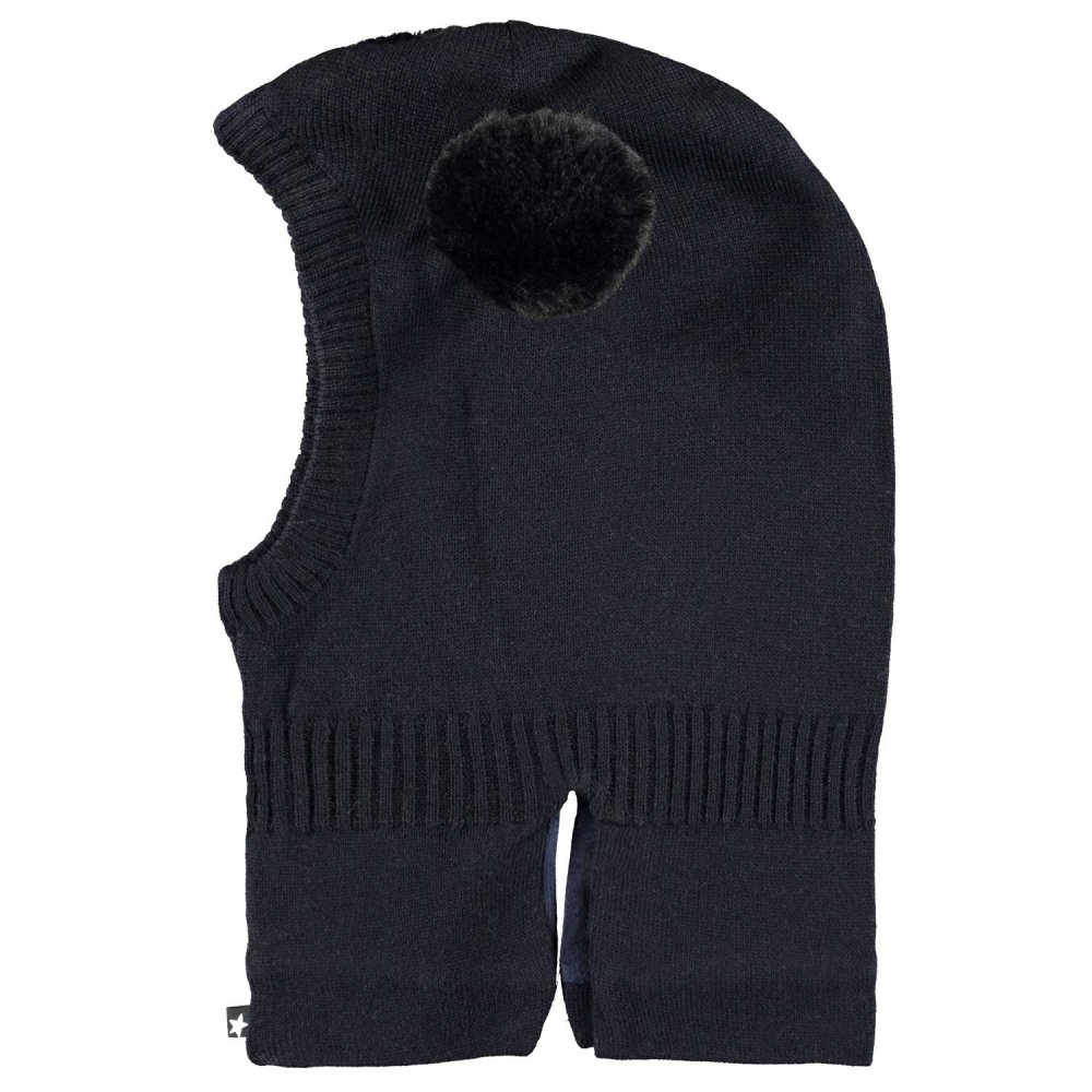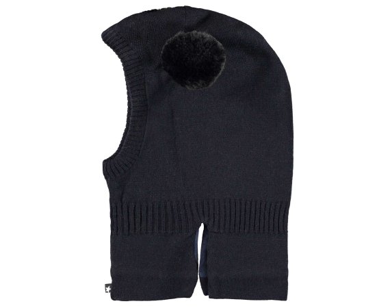 Blå, dejlig varm elefanthue i strik og to lag med påsyede faux fur pelskvaste.