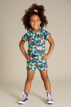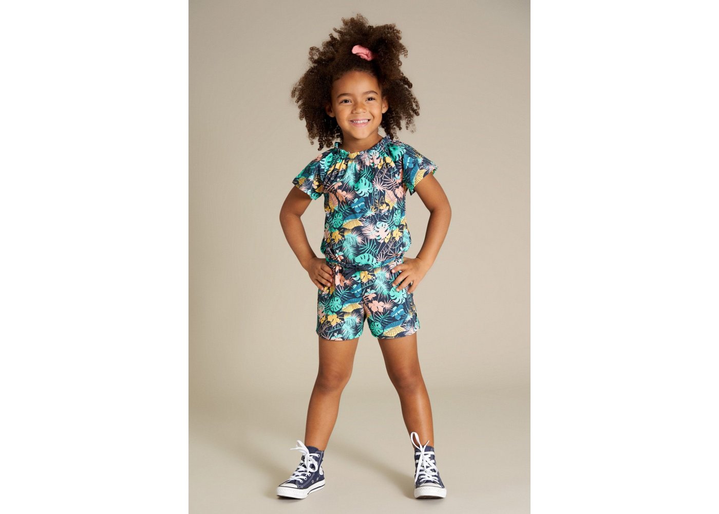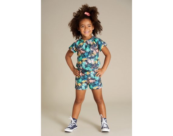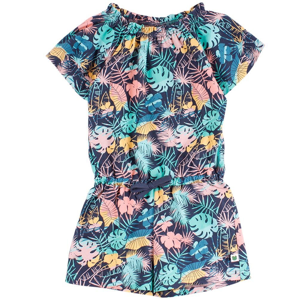 Blød og lækker buksedragt med eksotisk palmeprint.Dragten har elastik i halsåbning og bindesnor i livet.