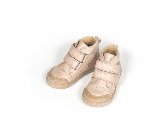 Skoen har en fast hælkappe med en læderstrop forovener, der gør skoen stabil for en barnefod.