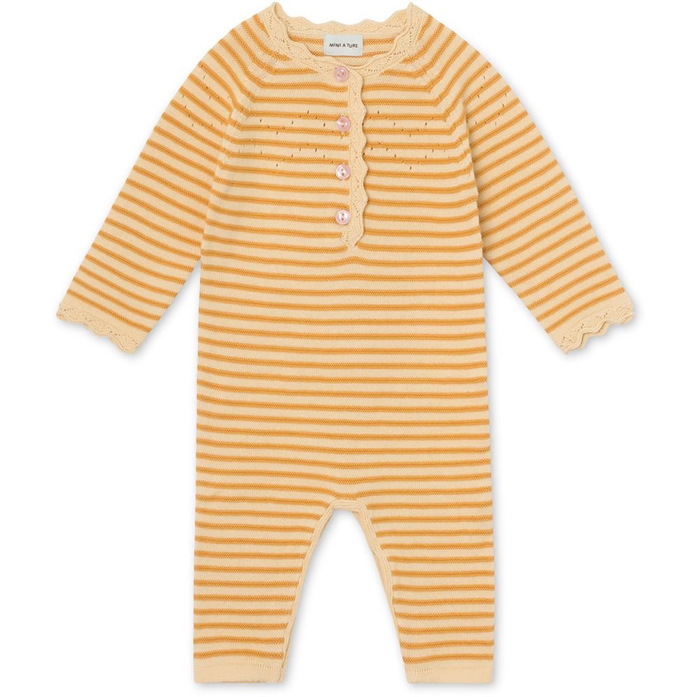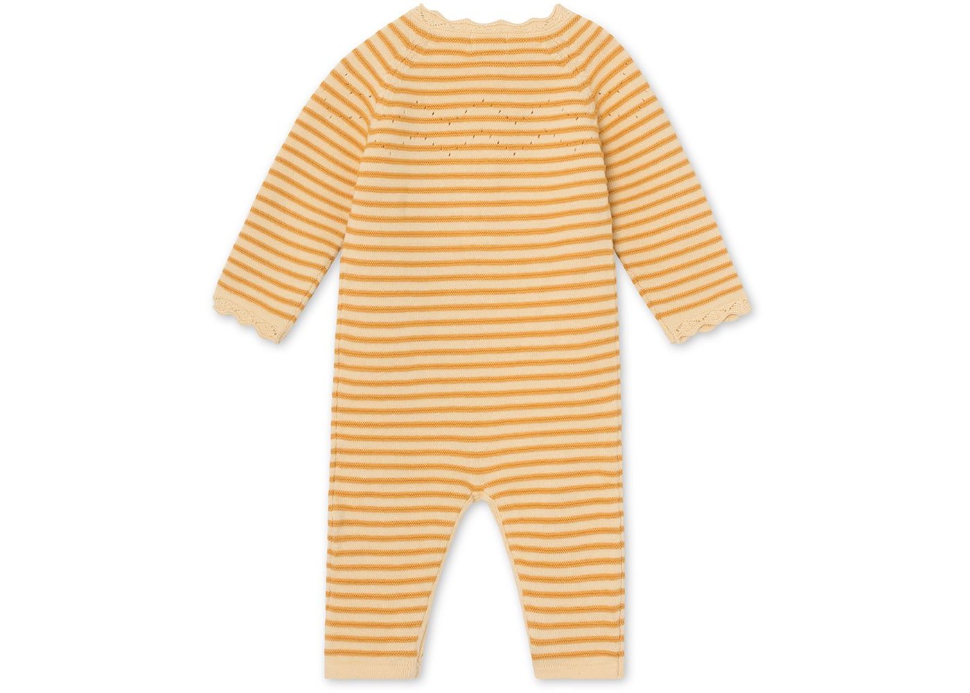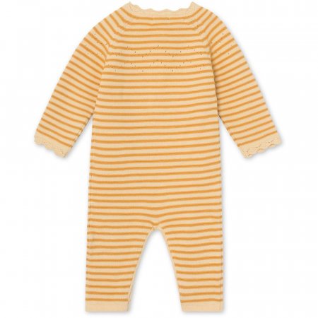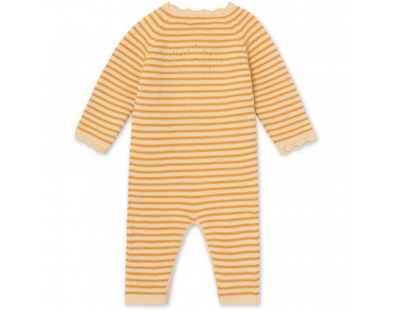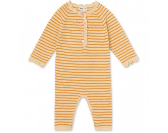Super skøn heldragt med striber, strikket i en blød, økologisk bomuldskvalitet.Romperen har lange raglan ærmer og et sødt hulmønster foran på brystet. Dragten har stolpelukning med knapper, og alle åbninger på trøjen har flotte bølgede strikkanter med mønster.